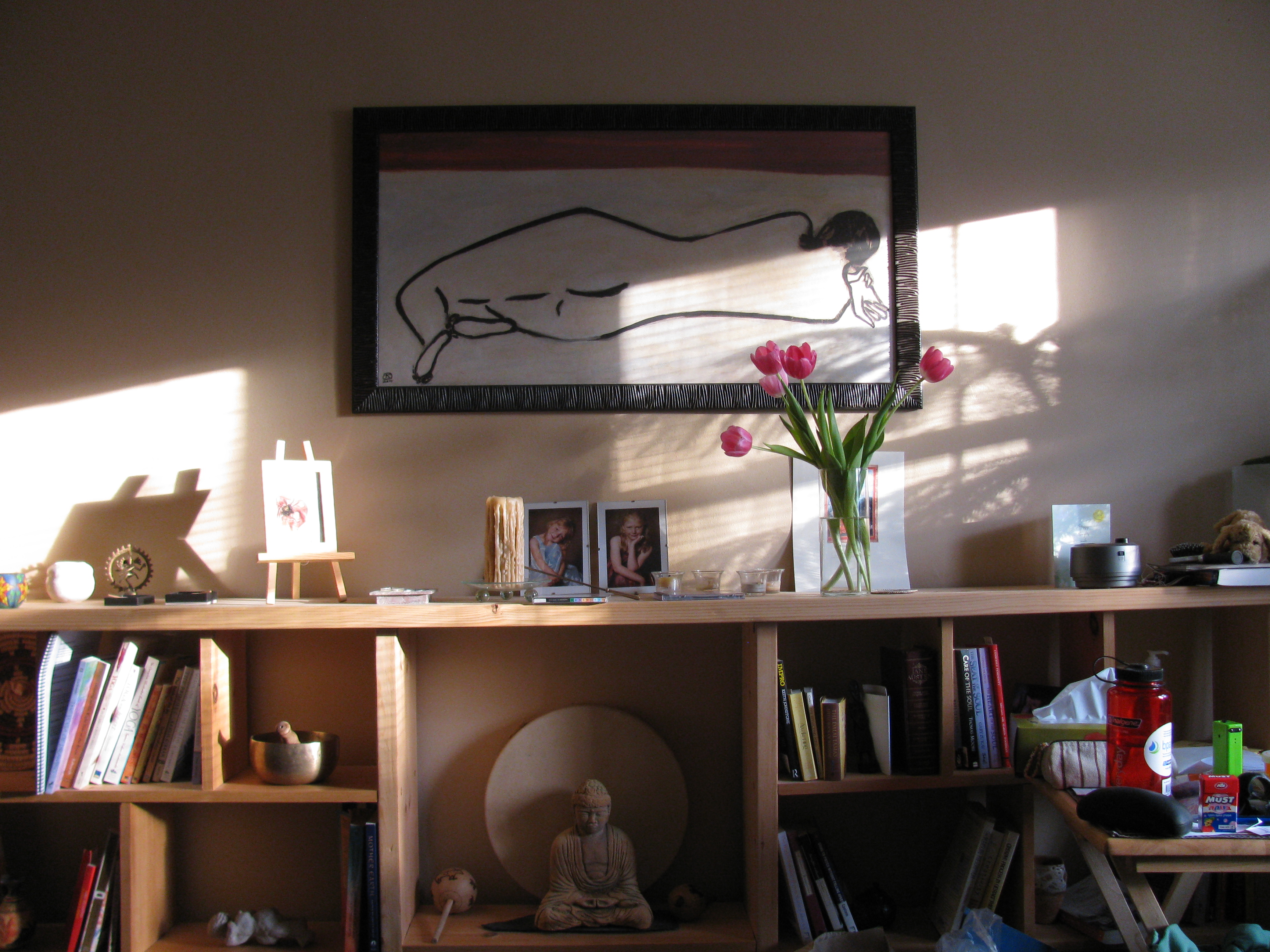 The upstairs room I stayed in (aka the Zen Room) was an oasis of calm. Sunlight streamed in for much of the day, infusing the room with steady warmth. The shelves were lined with books related to healing, mindfulness and guidance. A small zen garden, candles, a gurgling waterfall and a small Buddha contributed to the sense of peace I felt in that space. Some mornings I would awake to the scent and overwhelming sight of a vase full of brilliant tulips. Oh, how grateful I was…