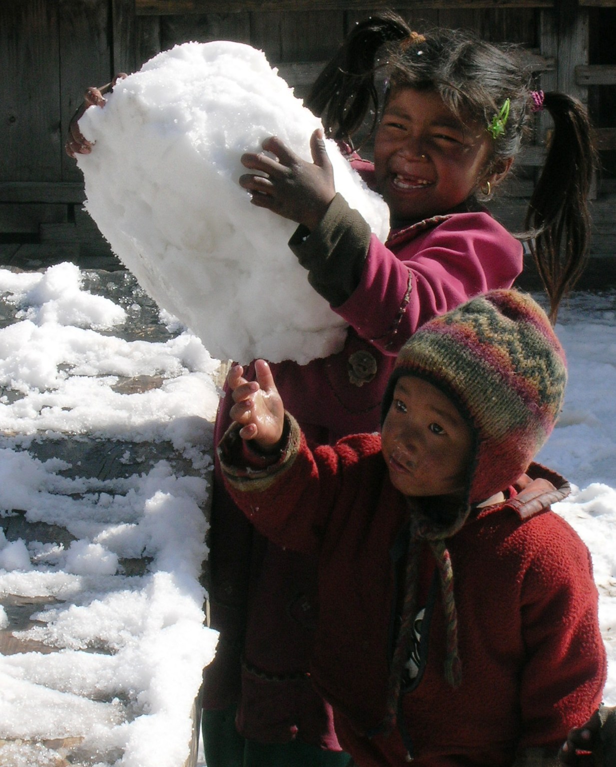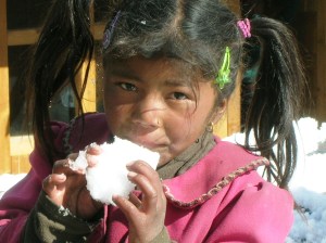 It happened while I watched my niblings suck on handfuls of snow in the backyard: a memory of Nepali kids, high in the Himalaya, frolicking in the white stuff. Their smiles were equally wide, eyes twinkling, as they savored the treat that nature delivered to the front doors of their ramshackle huts. Bursting with the color of mismatched hats and gloves, they first stopped to gaze at the foreigners in their midst. Soon after, timidity gave way to howls of laughter.