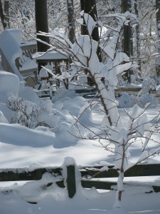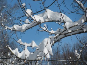 Ever the pilgrim, I headed out for a morning walk to see what I could see. Stumbling here and there over a hidden patch of ice, I felt both grateful and relieved (despite the considerable pain) to be hobbling along in bright sunshine. The trees were graced with a balletic quality; as if piles of powdered sugar were balanced precariously on the palms of small childrens’ hands, and elongated coverings of pure white silk were draped over outstretched tree-limbs, creating a chiaroscuro effect. A surreal landscape, regal and random, had been woven through towering trees and electric cables.