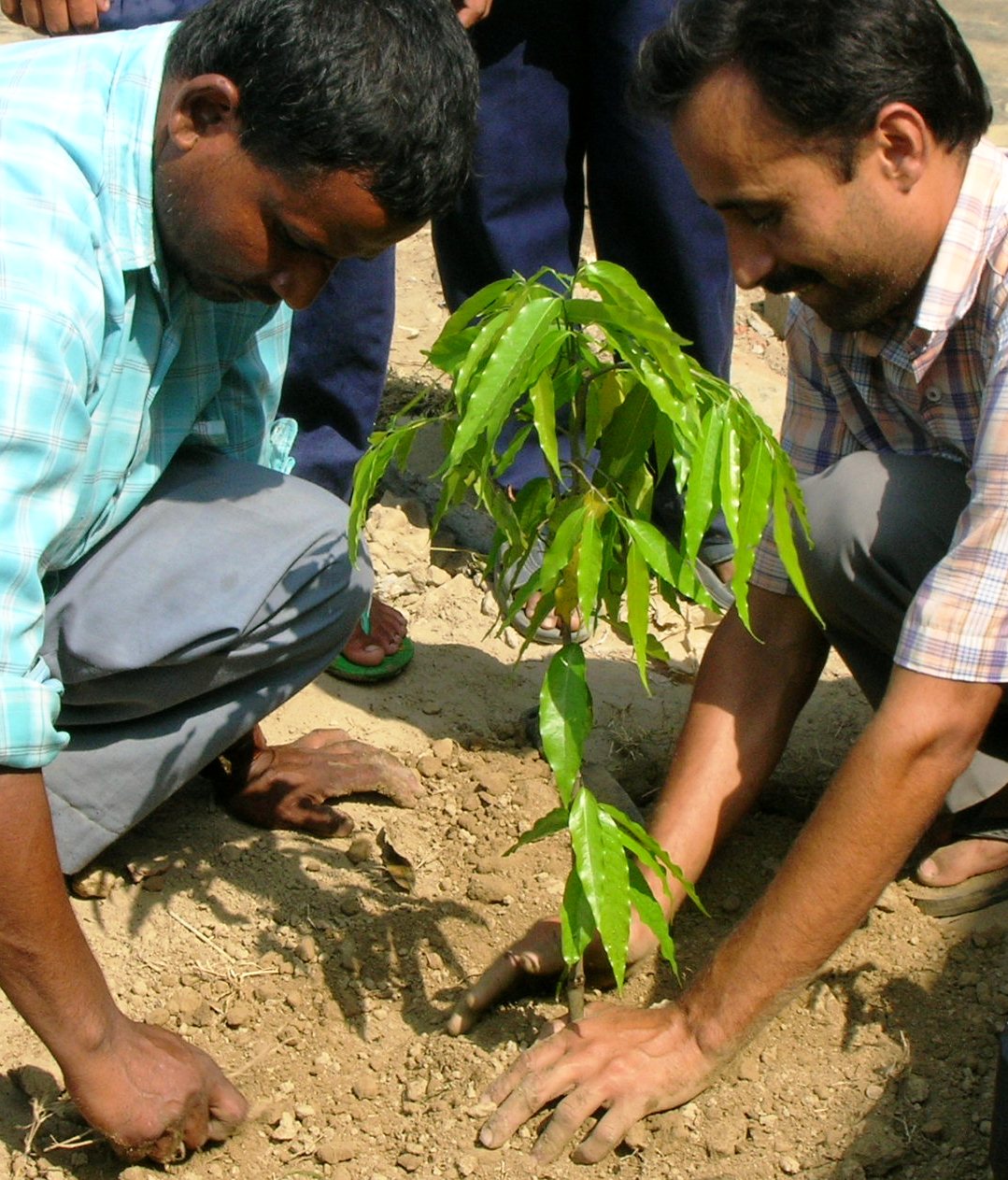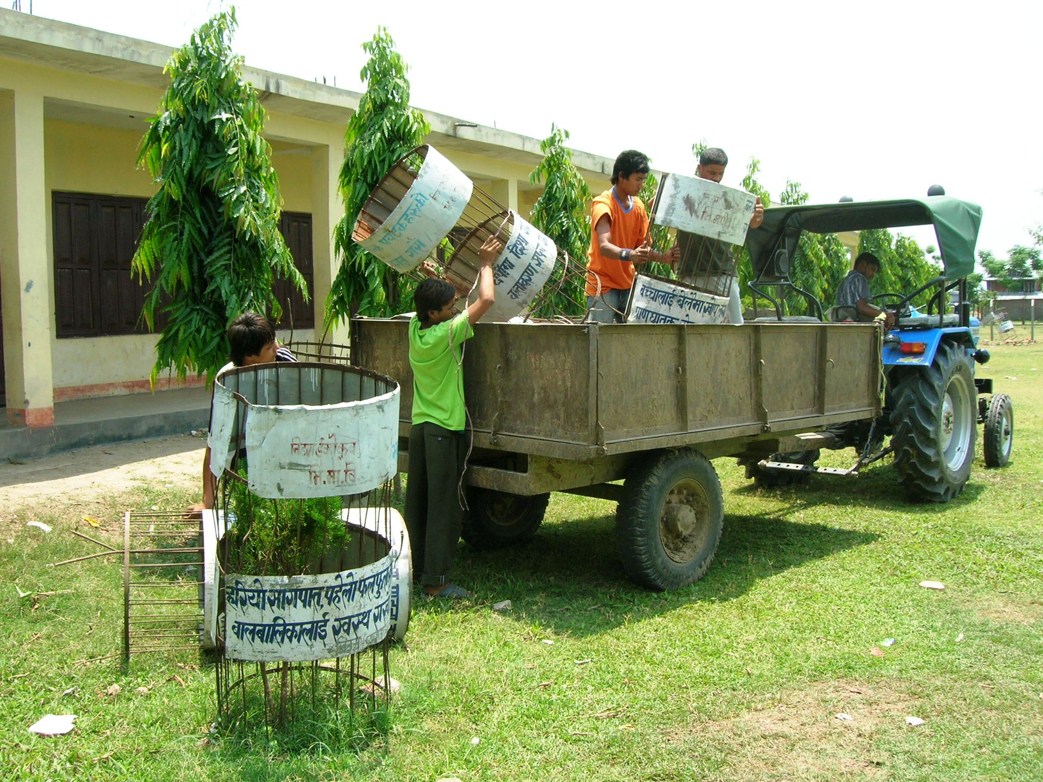 One particularly humid day, we set out on an adventure: I rode with Shiva on his motorbike, while a group of male students followed behind; straddling a large tractor and trailer-bed, they carted from a nearby school numerous large metal tubular structures that we would place around each tree for protection from trespassing cows.