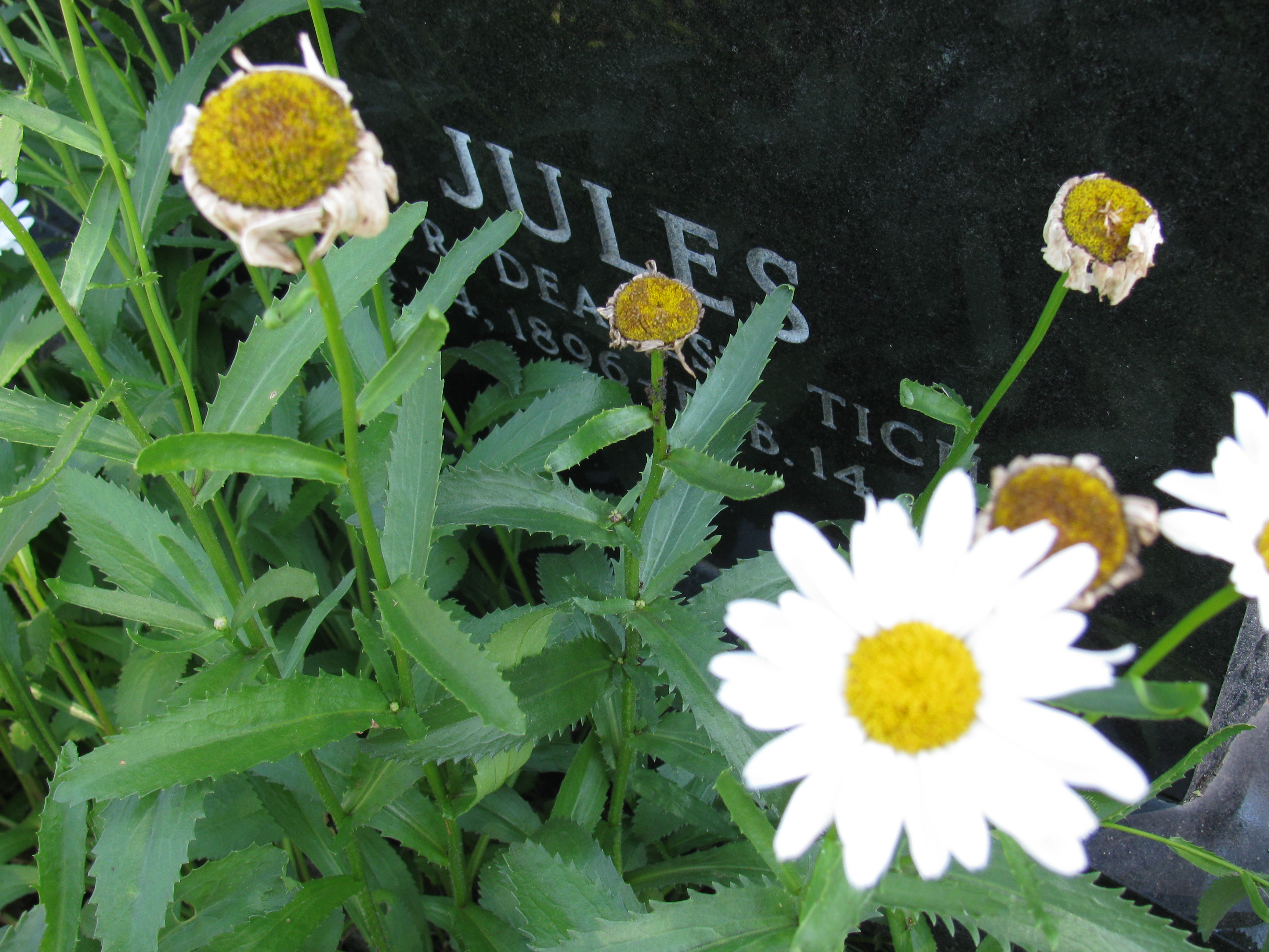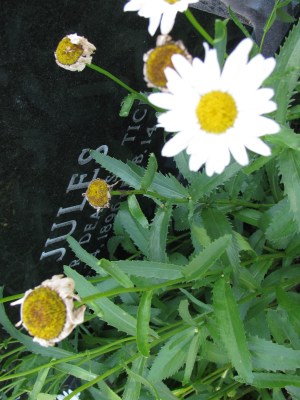 But first: I was on my way to a therapeutic massage, when due perhaps due to traffic problems ahead, I veered off the most direct route and ended up taking a break in an oasis of silence. I went to visit my grandparents, who now live in the same ‘hood, so to speak. Seeking perhaps strength and sustenance from my (our) ancestral spirits, that was just where I felt I had to go. It was peaceful, hot, sunny and the wild daisy patches in front of all their graves were thigh-high, standing out starkly against the more modest gardens of plots nearby. I stood with each of them for awhile, because that is where I am best able to connect with memories of them; their lives and struggles.