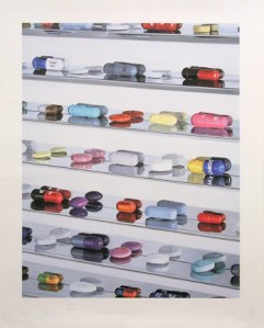 And then a series of works took my breath away: Hyper-realist paintings of pills, a rainbow of medications, different sizes and colors, lined up like soldiers on glass shelves. Each of the little tablets has a style all its own. As if they are in a display window, on parade – rather than hidden away in a bathroom cabinet. The reflections are mesmerizing. The pills, so tempting to the eye. Like candies at a candy store. As if to say: Which one shall I choose today? Take a look at a painting called “Pharmaceuticals.”