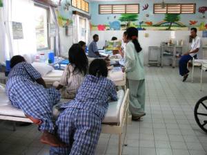 The busiest place of all (perhaps even busier than the O.T.), was the childrens’ side of Ward C. Indeed, capping a week of story readings (thanks to Lida, the teacher) and art projects, the ward – at least for a few hours a day – became a veritable hub of creativity. The kids made crowns and butterflies, colorful chains and pictures of animals. Neighboring patients Leak and Nasarith led the pack, their artistic output limited only by the time allotted each day.