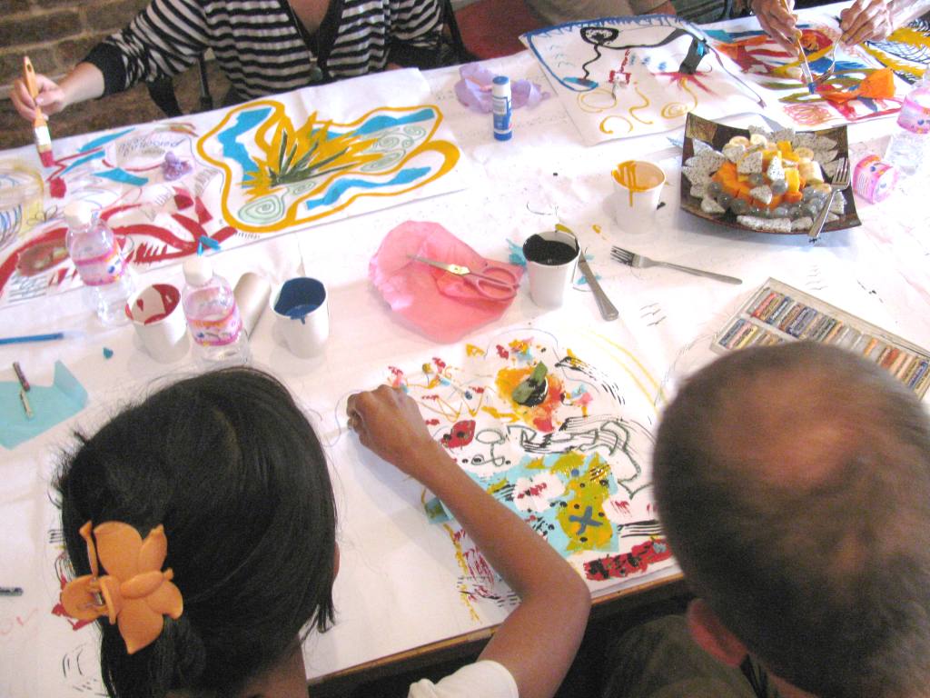 A handful of ex-pats: One South African. One Swiss. One Canadian. A few Americans. Three Cambodians (including two from Phare). The Kinyei Team (a mix of Aussies and Khmer). Reams of ‘butcher paper.’ Tissue paper. Oil pastels. Paint (supposed to be acrylic, but was not perhaps due to the request being lost in translation). Paintbrushes. Q-tips. Forks and knives. Freshly-picked banana leaf. Masking tape. Scissors. Section of the Phnom Penh Post. Toilet paper roll. Water. Fruit: papaya, dragonfruit, banana. Shake, stir and wait for magic to happen.
