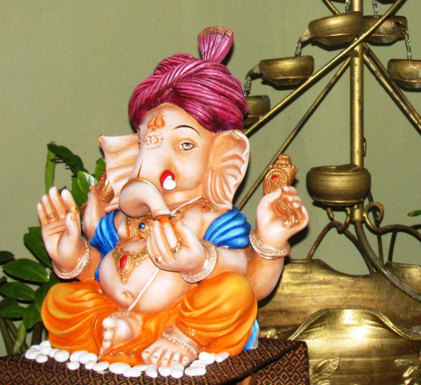 ginger tea and a biscuit (amazingly, the cookie fits ever-so-perfectly onto the little clay plate!). The couches are cushioned, the lights low, magazines laid out on a coffee- (um, tea-) table, and a waterfall in the corner sends gurgling liquid streaming down and through a structure of joined bronze pouring pots. In front of the waterfall sits a colorful statue of Ganesh – the Hindu deity that is lord of success and destroyer of evil and obstacles.