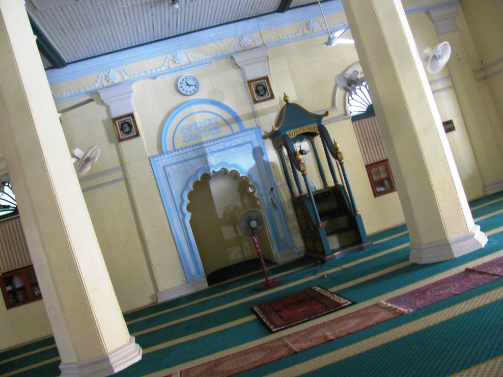 An Indian vegetarian restaurant next door to a Hokkien Chinese restaurant serving pork specialties. A mosque next to a tra