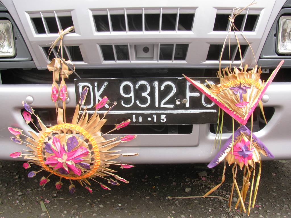 Prayers are recited, more offerings – little trays made of palm, filled with flowers, rice and pieces of fruit and food – are laid out on the ground in front of homes, shops, temples. These talismans, indicating that the vehicle or item has been blessed, remain attached even once they have withered and dried out; until they are blown away by