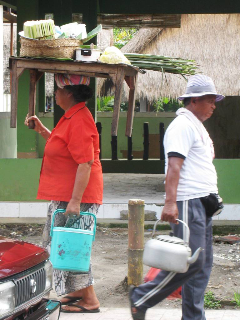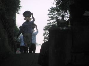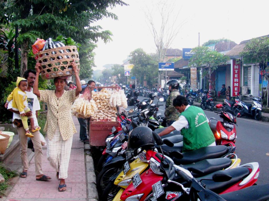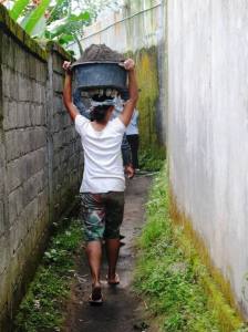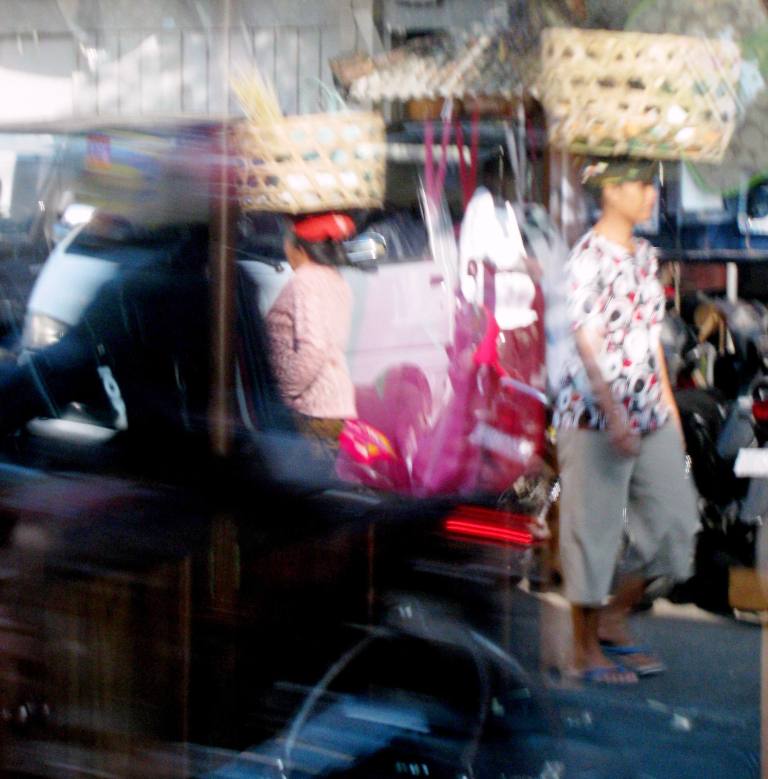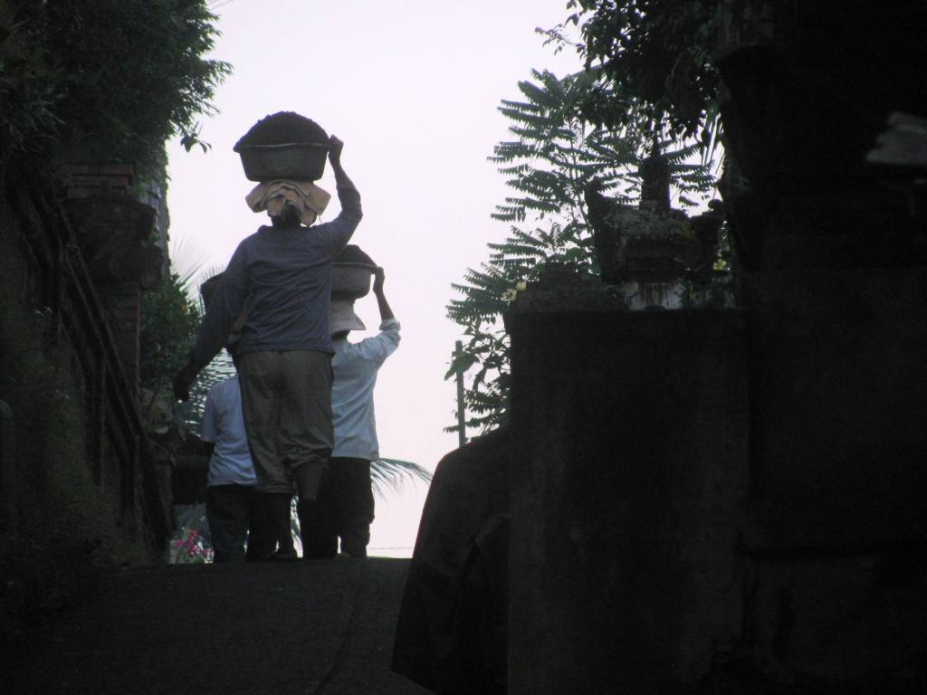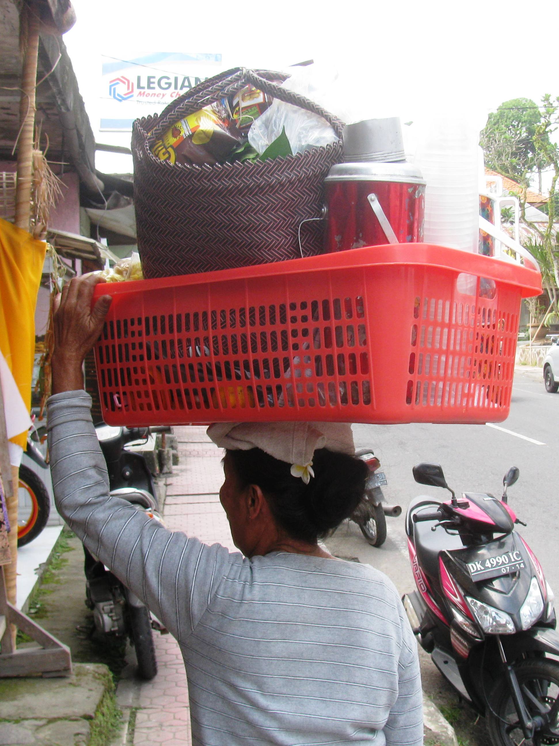 I have crossed paths with women carrying a vast spectrum of weighty stuff; rocks, bricks, large bamboo or rattan baskets laden with food or their belongings; plastic baskets filled with Balinese snacks or thermoses with steaming kopi (coffee).