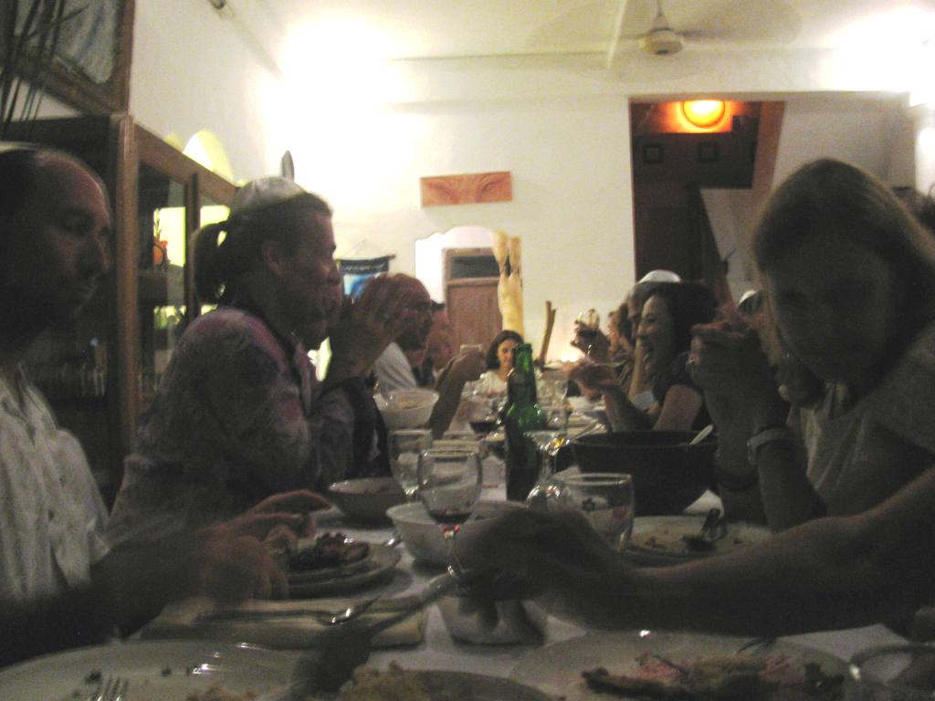 It was an evening to remember: We entered the front courtyard through a remote-controlled gate. The open air dining area was brightly lit and bristling with energy; adults and children speaking a mix of languages, mainly English, French, Hebrew and Indonesian. The lower floor was covered with paintings of Ganesha and Om bas-reliefs alongside mezuzot and batik pieces with writings in Hebrew. About fifty people were seated around a U-shaped series of tables. Covered in white tablecloths, dotted with vegetarian dishes galore: carrot, beetroot and green salads; humus, baba ganoush, eggplant with tomato sauce, potatoes, fish, challah bread and a real treat. The wine (imported from Israel) flowed all night. Liat’s catering staff (maybe 8 women) kept busy cooking and serving a constant flow of nutritious and delectable dishes.