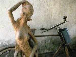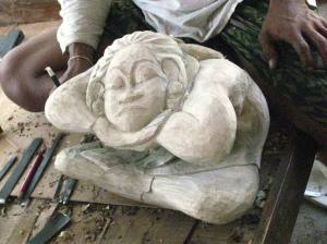 A number of sculptures were in various stages of completion, among them a sandalwood carving of a woman with a sarong, her arms above her head; and a figure standing tall, lithe and in a pose that suggested movement.