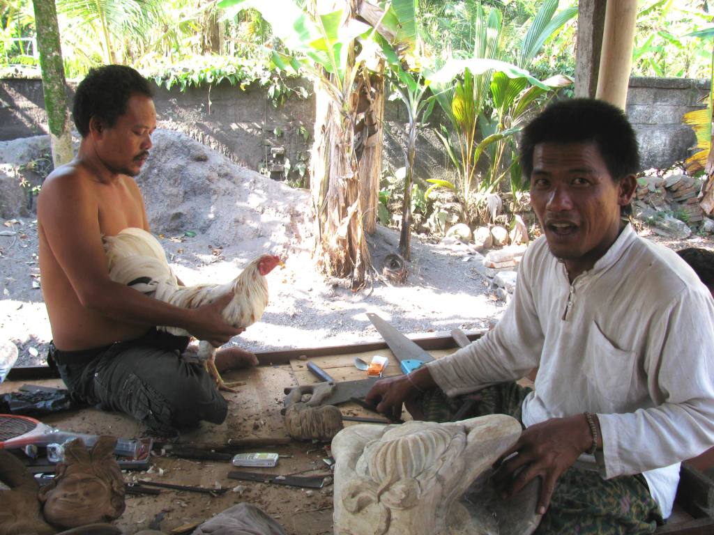 A stone’s throw from rice fields and a running stream, in the shadow of a coconut tree, a group of men worked daily in this compound. They churned out new carvings regularly, typically selling them to shops along the main road in Mas.
