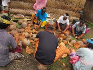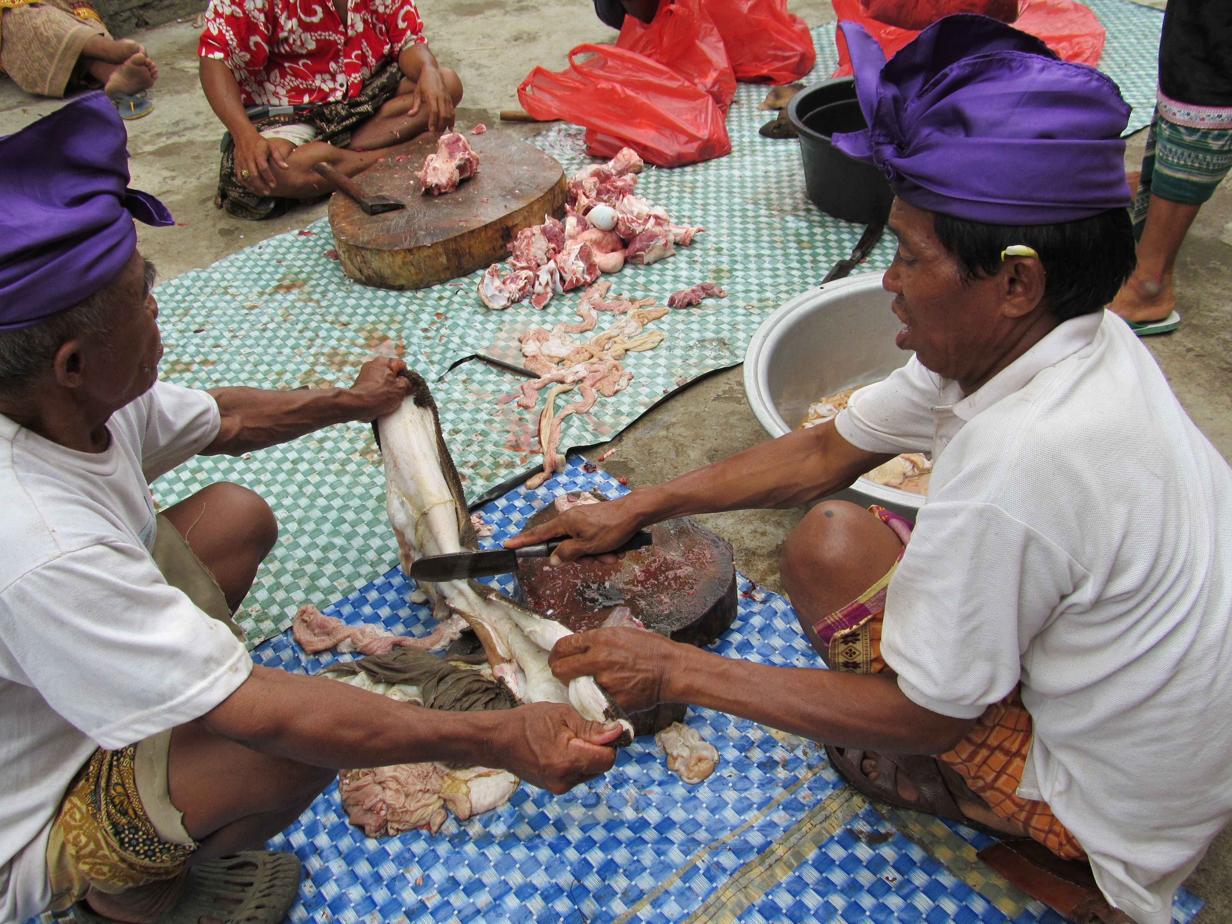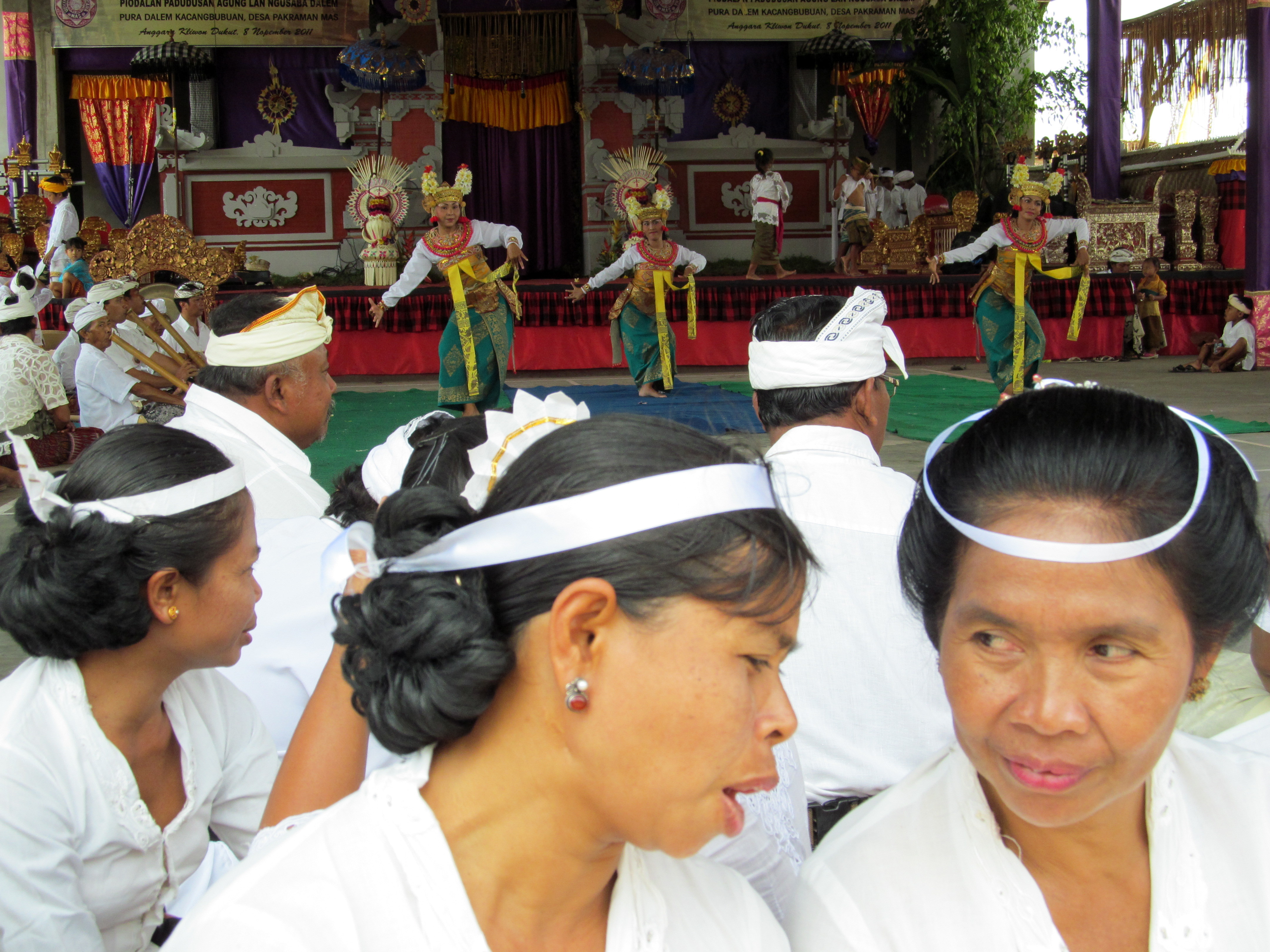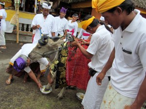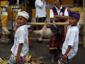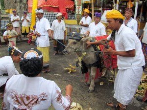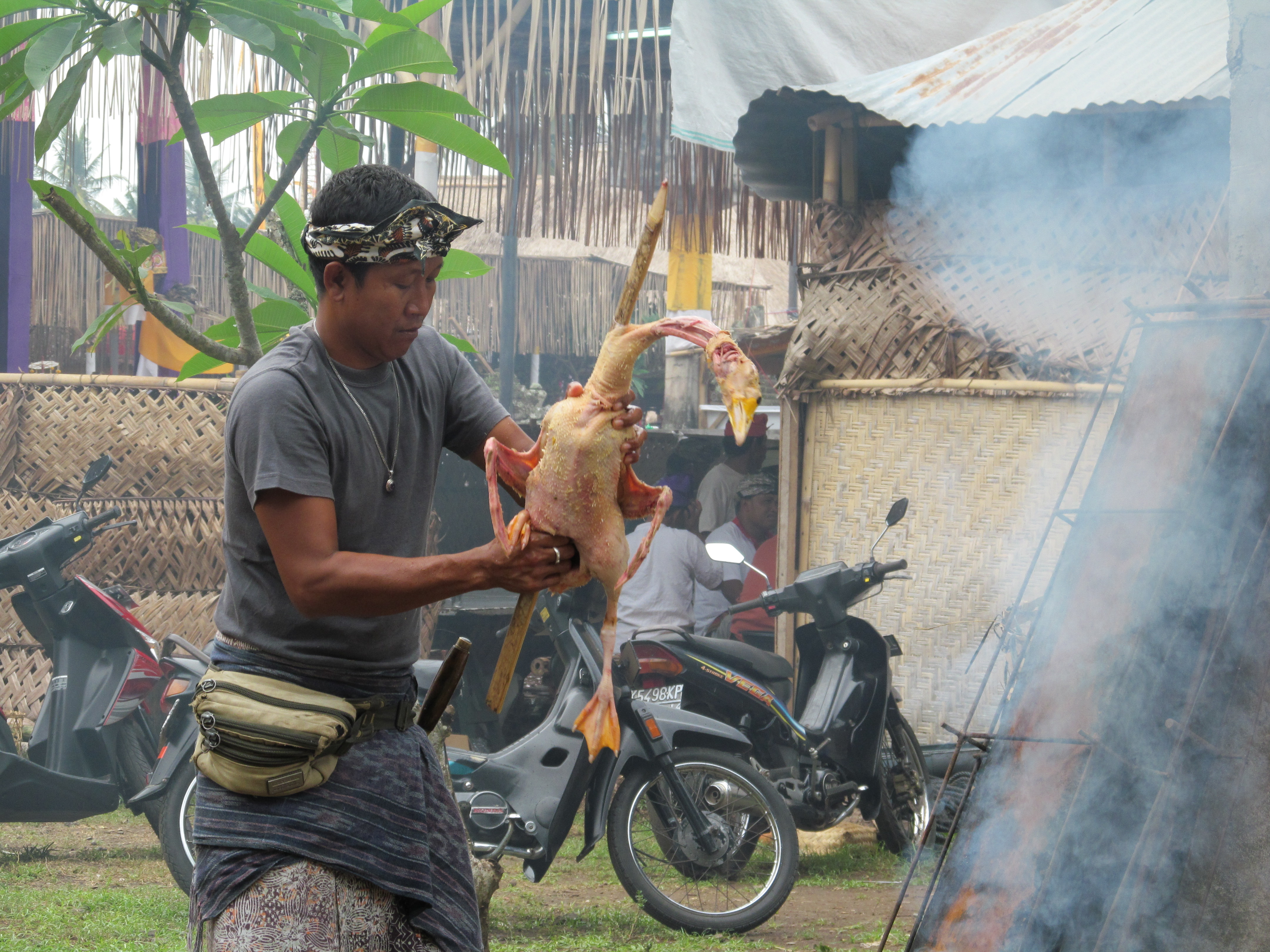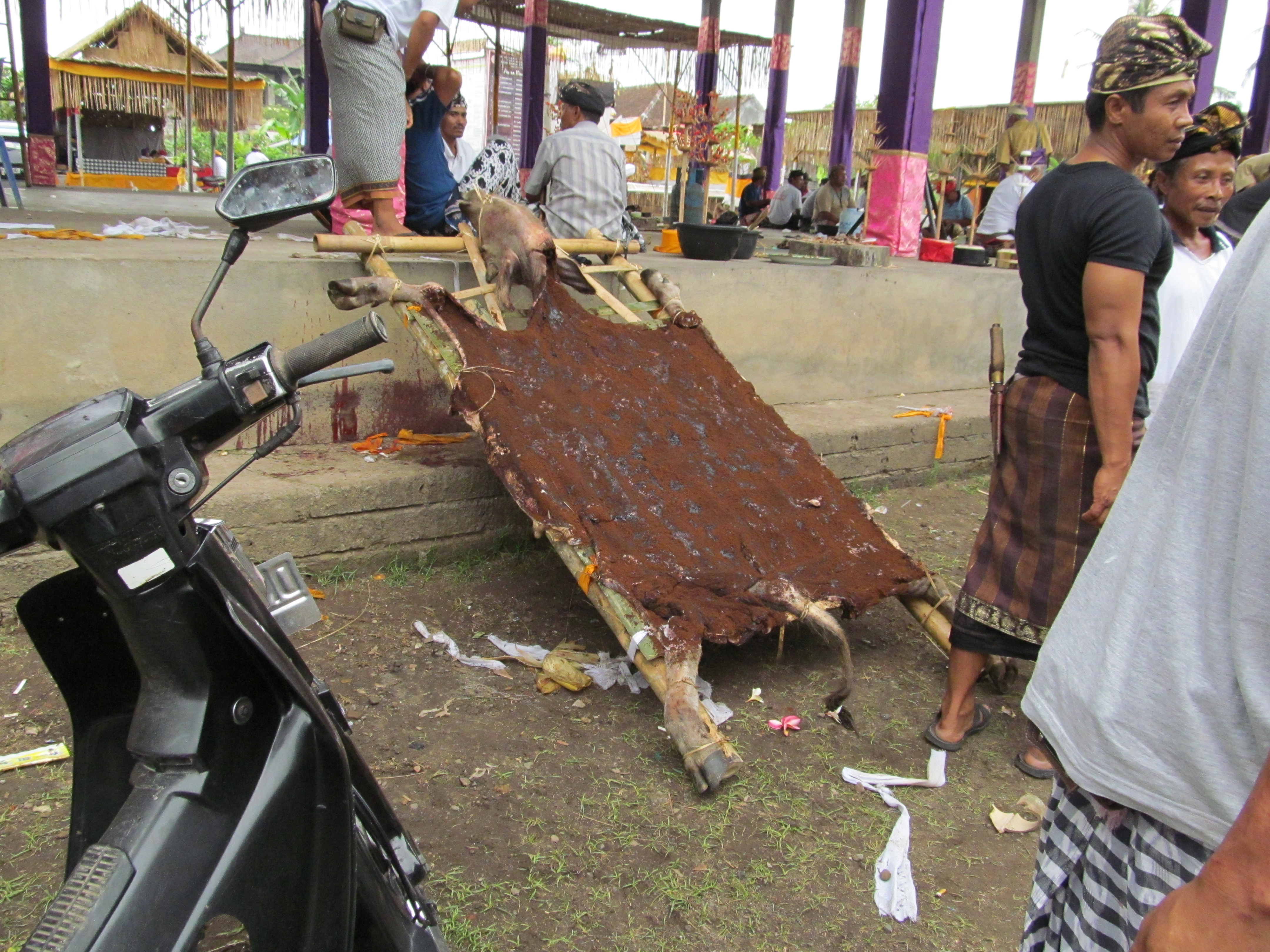 The spectacles, too many to list and explain, were wonders to behold (and occasionally participate in): Prayers. Offerings. Sprinkling and drinking of holy water. High priests. Low priests. Invited guests from around Bali. Music. Gamelan groups. Dance. Dance. And more dance. A sacred (i.e. no-filming) dance too. Burial of offerings and valuables in temple ground. A parade with, and slaughter of, sacrificial animals – and not just pigs! Food & feast: Skinned, chopped, cooked – spiced up with mountains of garlic and onion. A lottery. Gambling and card-playing. Cock-fighting. Laughter. Speeches. Gratitude. Tears.