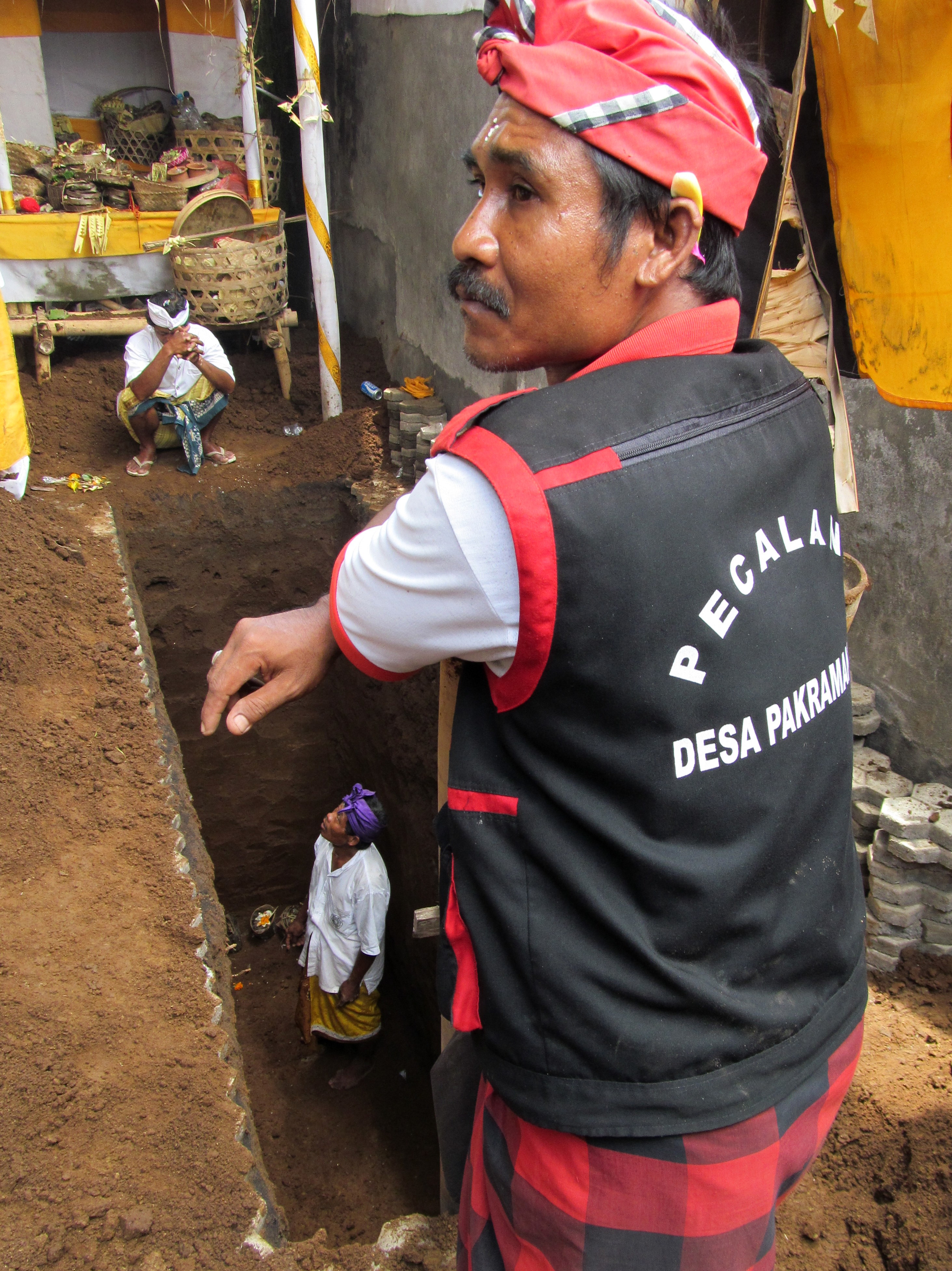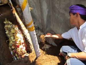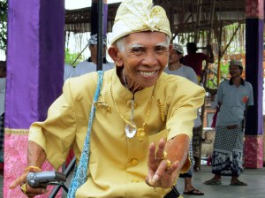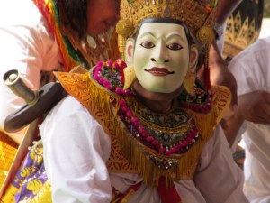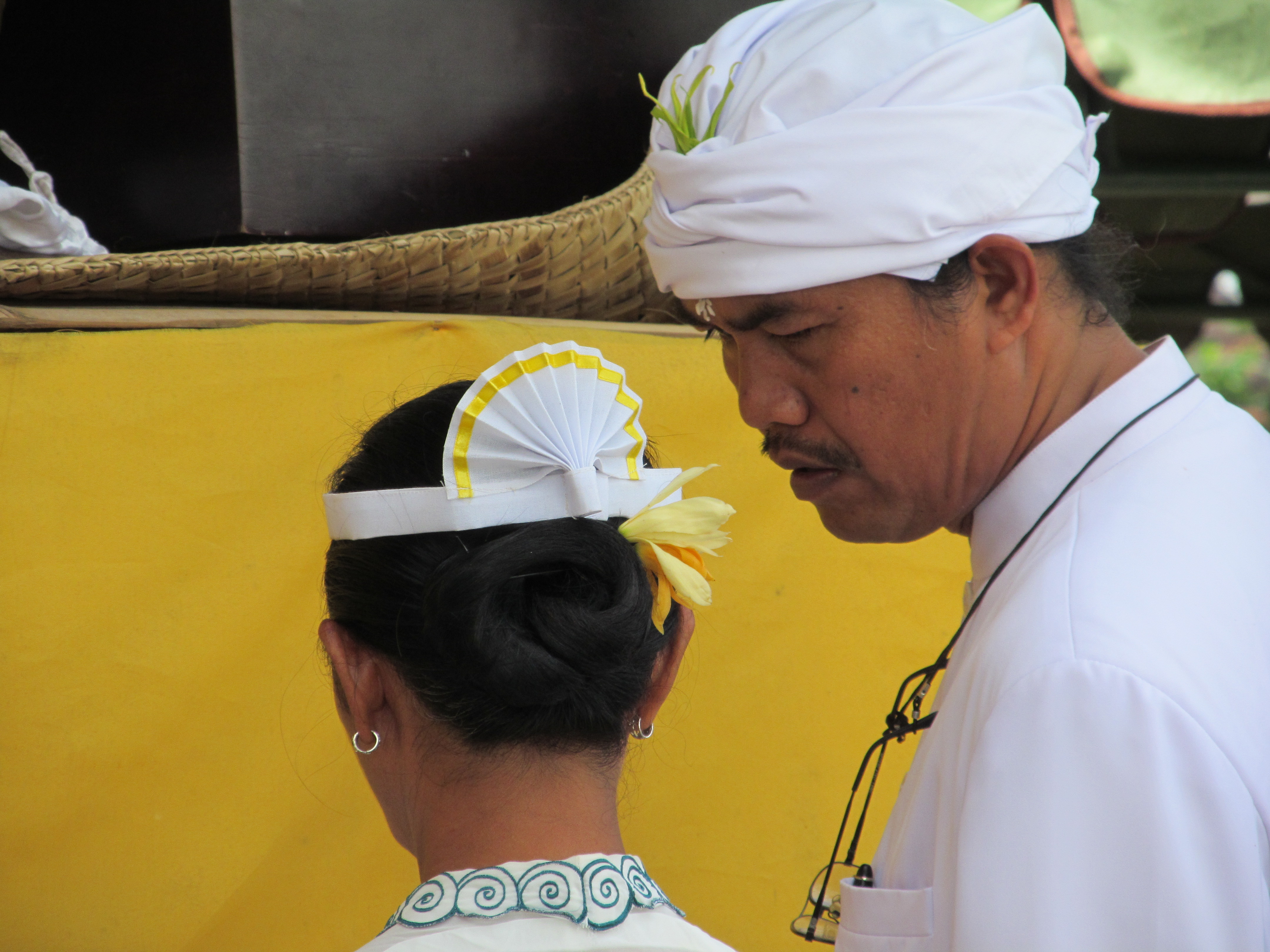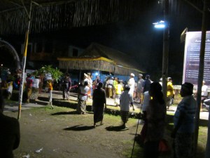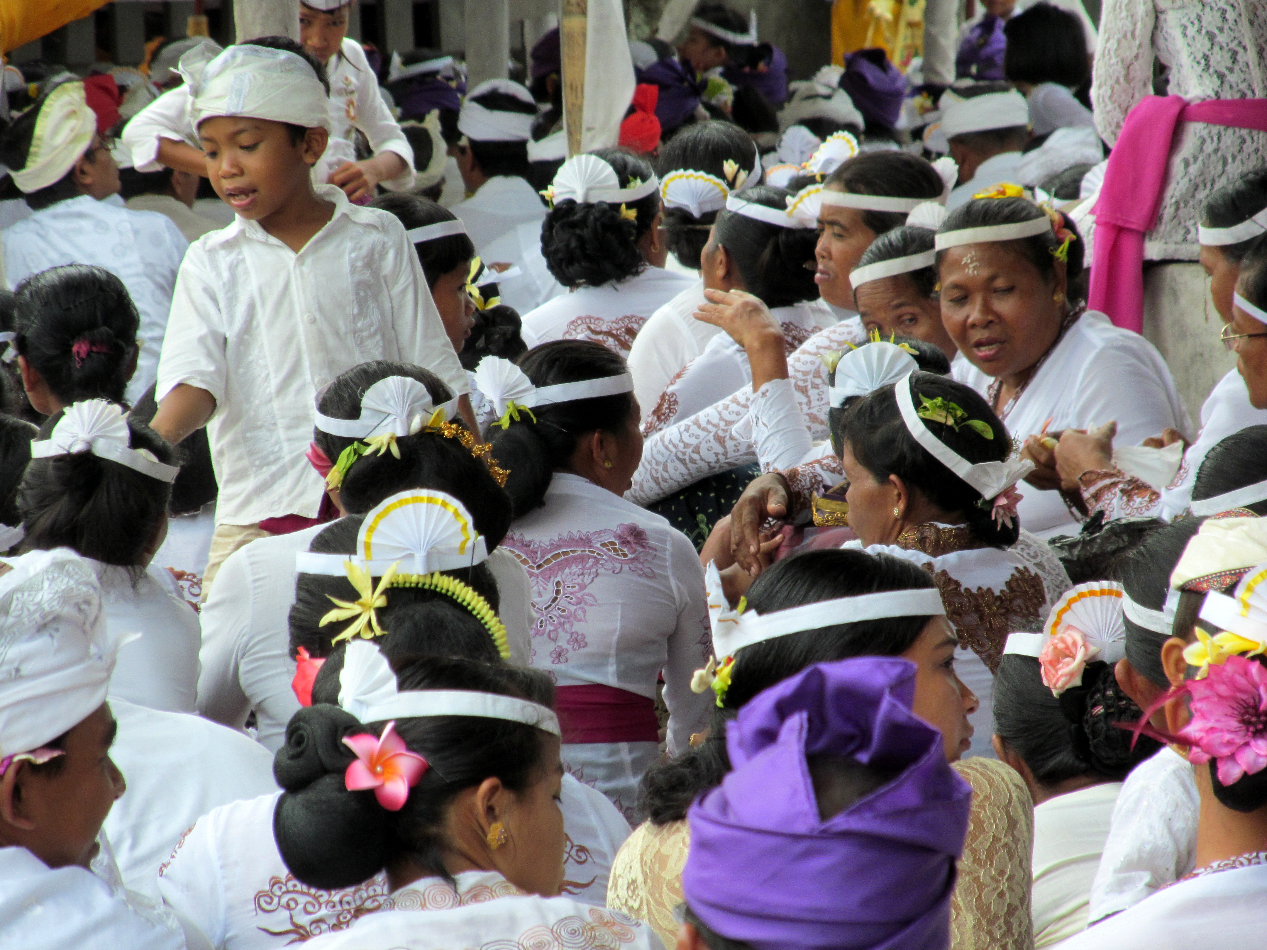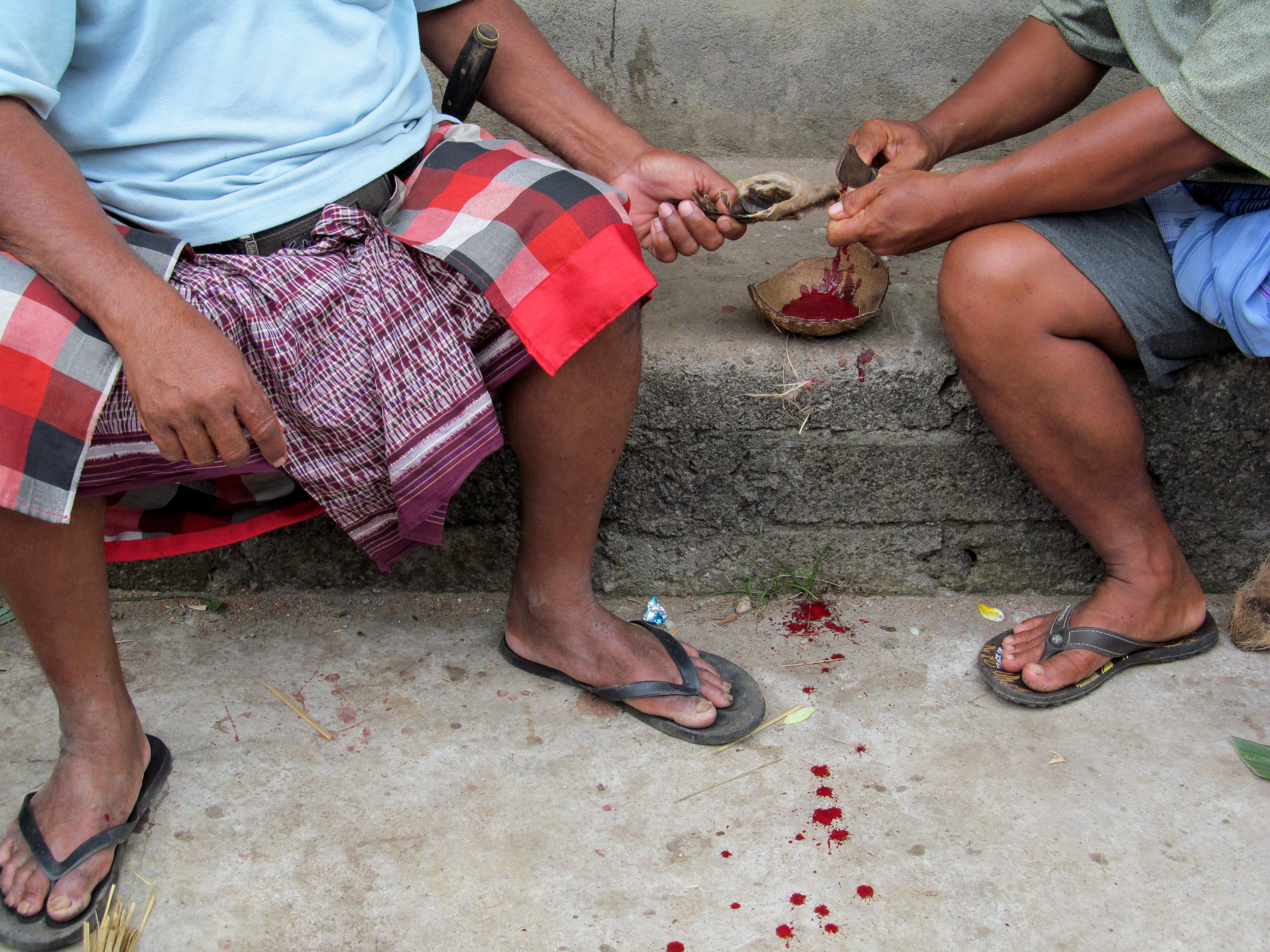 The spectacles, too many to list and explain, were wonders to behold (and occasionally participate in): Prayers. Offerings. Sprinkling and drinking of holy water. High priests. Low priests. Invited guests from around Bali. Music. Gamelan groups. Dance. Dance. And more dance. A sacred (i.e. no-filming) dance too. Burial of offerings and valuables in temple ground. A parade with, and slaughter of, sacrificial animals – and not just pigs! Food & feast: Skinned, chopped, cooked – spiced up with mountains of garlic and onion. A lottery. Gambling and card-playing. Cock-fighting. Laughter. Speeches. Gratitude. Tears.