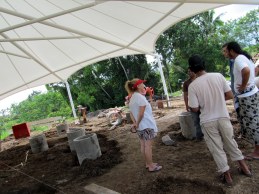 I’m plugged into my work when I suddenly hear a new sound in the distance, a sound that clearly does not emanate from nature… It takes me only a moment more to realize I’m listening to the unmistakable rumblings of a cement mixer. Ah yes, they’re pouring concrete into the circular foundations of the meditation dec