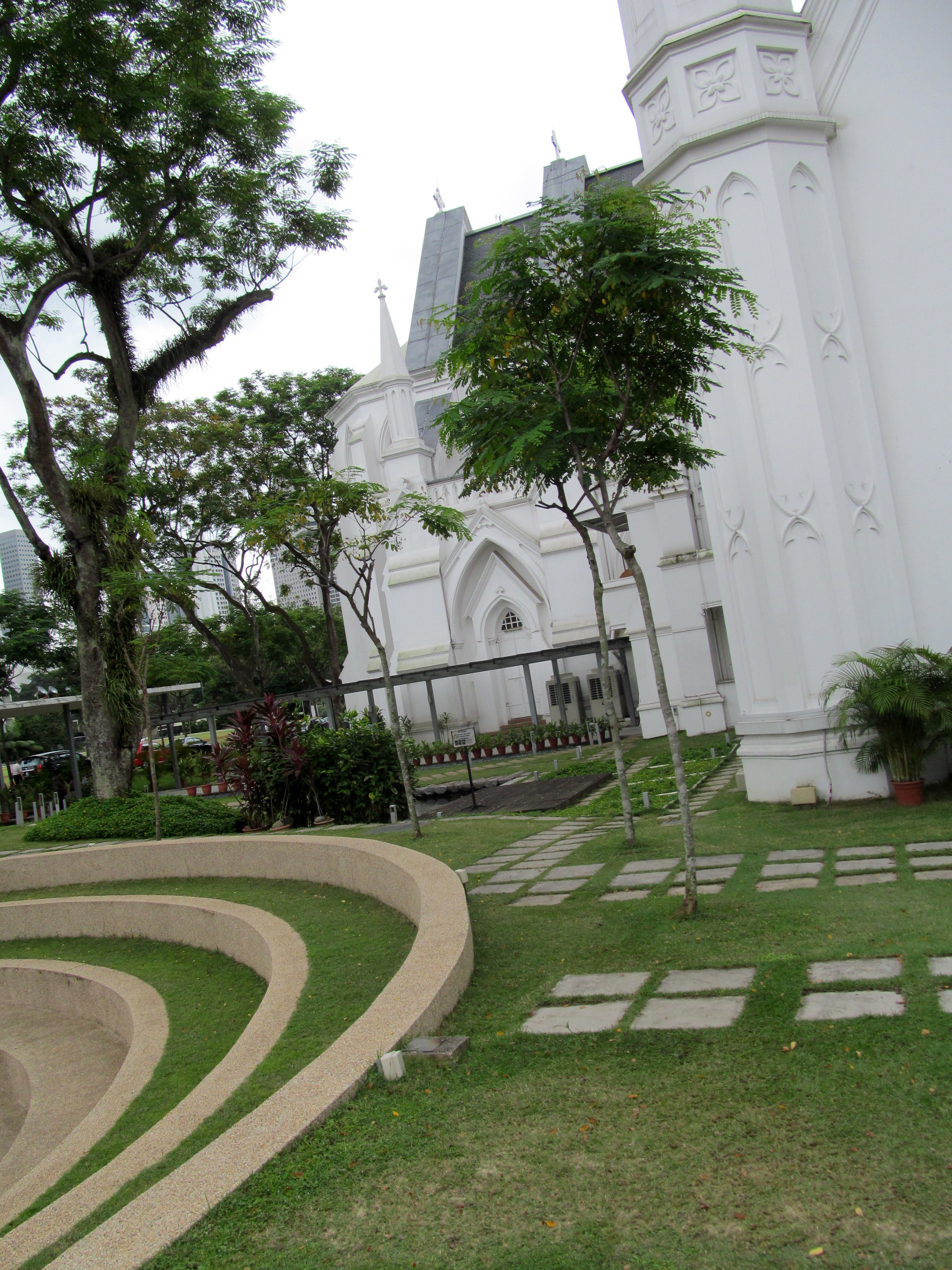 After a couple hours of walking, I was in dire need of rest so I headed to my usual and favorite resting place in Singapore: the lawn of St. Andrew’s Cathedral, where I tend to stretch out on my back on a grassy patch, my umbrella angled just so, to ward off midday sun and heat. But alas, five minutes or so before arriving at my idyllic midtown oasis, the skies opened and the rain came falling down. Oh no, mucky muck instead of dry grass.