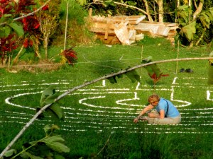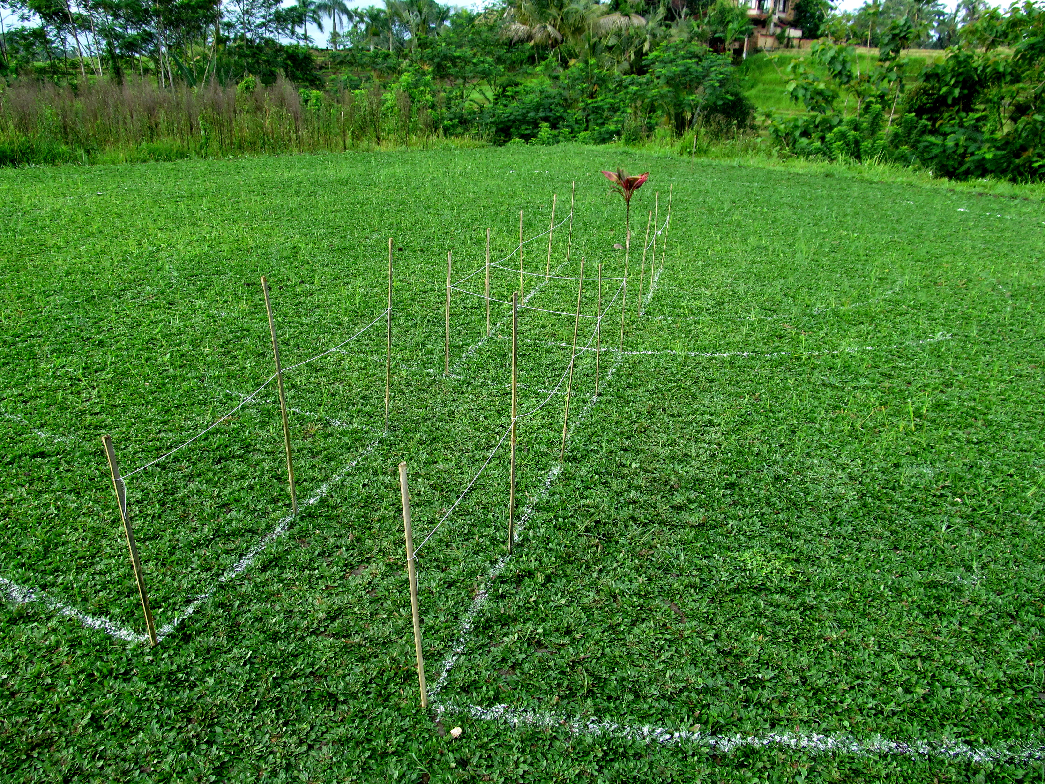 And so, at P’s invitation, I jumped at the chance to design and create a labyrinth at her still-under-construction meditation retreat center. In Tabanan. In the shadow of Mt. Agung and Batukaru. Using planted grass, inlaid with limestones marking the borders of each circuit. To be bordered by an octagonal-shaped perimeter of plants and flowers.