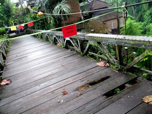 I spent the past week printing up and laminating signs that read: Danger, Bridge Unsafe to Cross, Hati Hati (careful) and Tolong Perbaiki Jembatan Ini (please repair this bridge). I bought a large bag of plastic/raffia rope. And this morning, with my activist friend R along, we hung the signs all across the bridge. Then I took photographs and texted some of my friends with the news, asking them to drive by.
