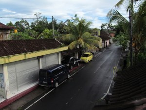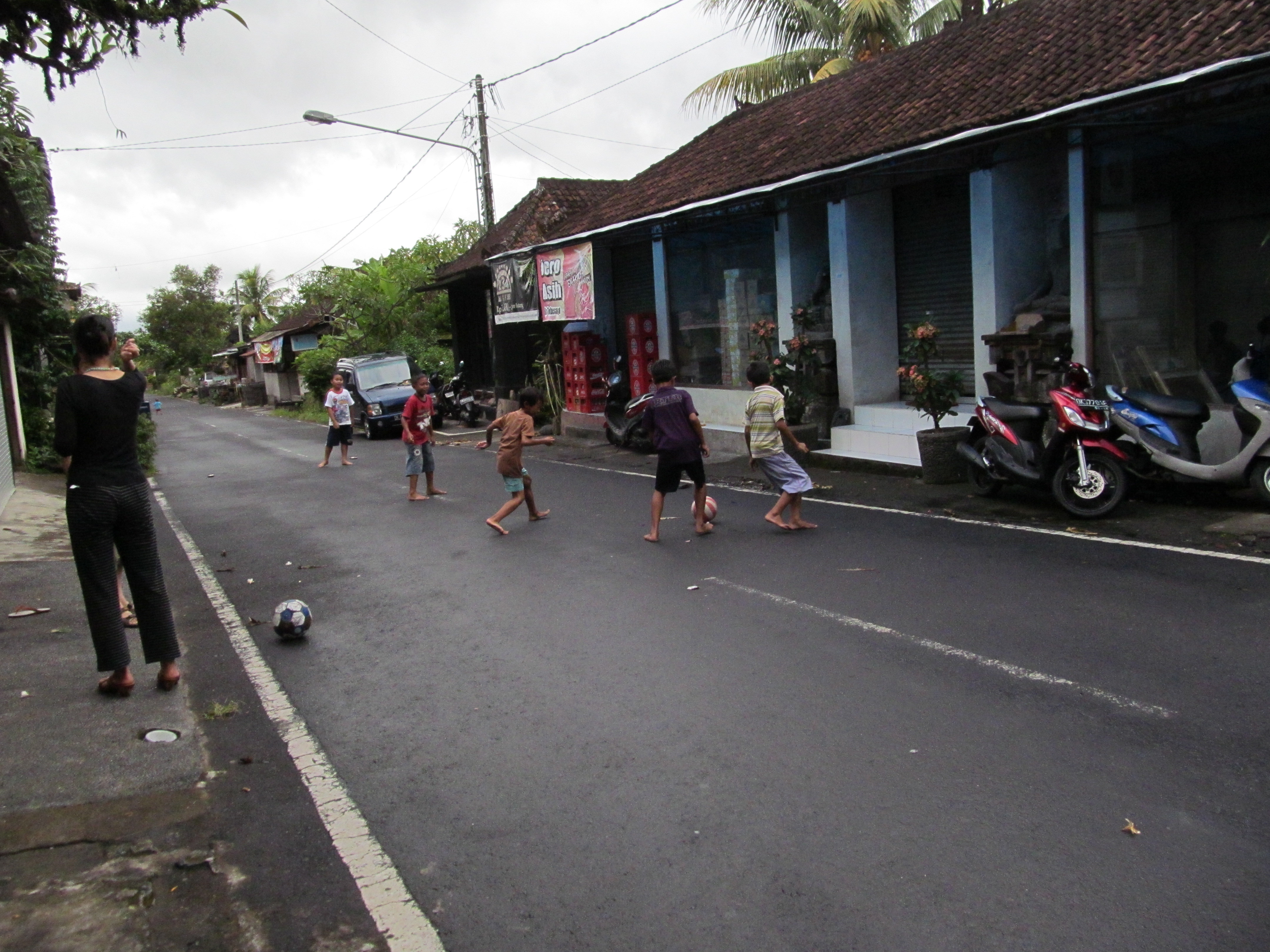 to ensure that the pecalang are out of sight. A group of boys is hard at play right out front with a soccer ball; evidently letting off steam, getting rid of their cabin fever. A mother and baby are walking slowly in another direction while a few dogs are splayed out in the middle of the road.