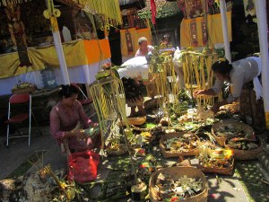 I returned home in the late morning and just in time: the momentous Odalan (temple birthday) ceremony taking place at Family Guesthouse all day tomorrow was being preceded by another ceremony this morning called mecaru. Only after seeing the vast array of offerings and shrine decorations, the gamelan musicians sitting in the shade at the ready, the pemangkus (priests) dressed in top-to-bottom whites, the toing-and-froing of all the family members, neighbors and assistant offerings makers; only after milling about the compound and family temple in bare feet did I learn the purpose of today’s ceremony: Blessing the ground and appeasing the evil spirits that lurk below.