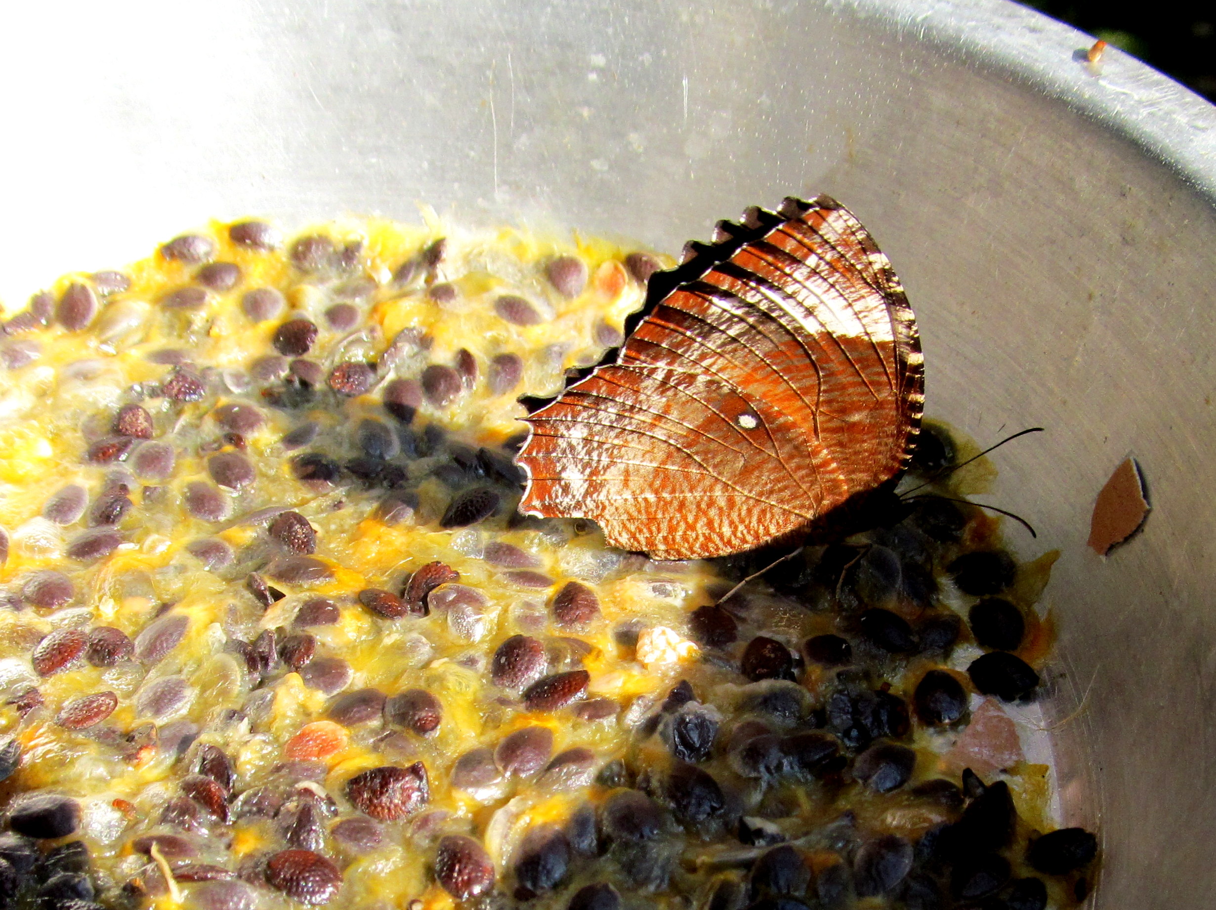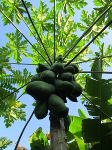 t a single window pane!) ensconced in the 24/7 surround-sound-and-sight lushness I so love (IMAX, eat your heart out). Fruit trees – mulberry, passion fruit, papaya, banana (pink, only for decorative purposes!); veggies – cherry tomatoes, Lombok chili peppers, kale, watercress; flowers – hibiscus, heliconia and frangipani among them; yellow and green coconut trees; crickets, cicadas, tokeks and cecaks