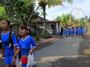 Hand in hand, arms draped over shoulders, the mighty penjors (still gracing streets from the recent festival of Galungan) swaying in the slight breeze above their heads, these kids were nothing if not boisterous, energized, all-too-happy to belt out a hello ibu! in my direction.