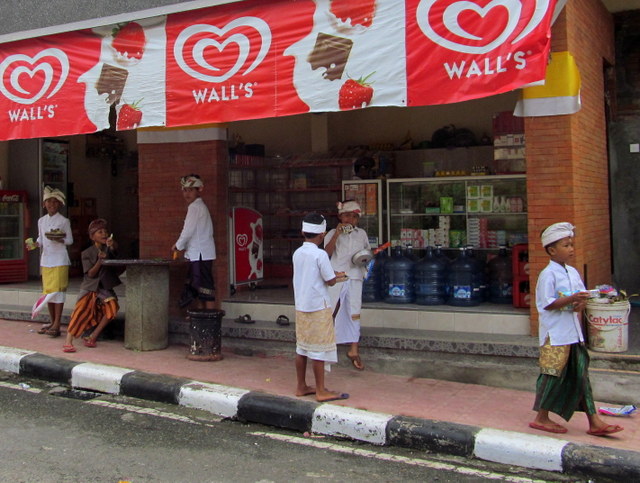Today, not surprisingly, this being the island of the gods, is another day of celebration: Hari Raya Saraswati, when Balinese people pray and give thanks to the goddess of knowledge, creativity and enlightenment. Saraswati day is celebrated every six months according to the Balinese calendar, thus twice a year. It’s a major festival when adults and children dressed in traditional clothing, place offerings in schools, temples and on the str