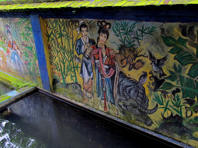 The interior of the perimeter wall is divided into sections, each lined with paintings depicting stories from Chinese mythology. Nearby is a path inlaid with images of animals from a Chinese astrological chart, and guarding some of the pavilions are statues of menacing dogs and a gnarly-looking dragon lording over the entrance. All are gifts from appreciative patients.