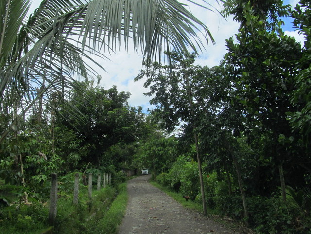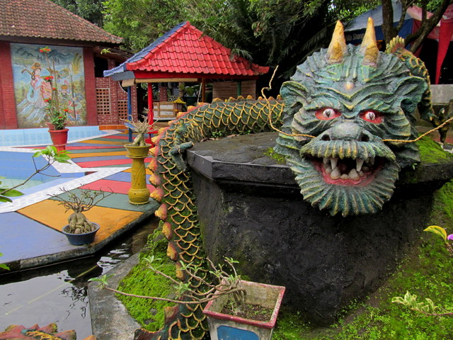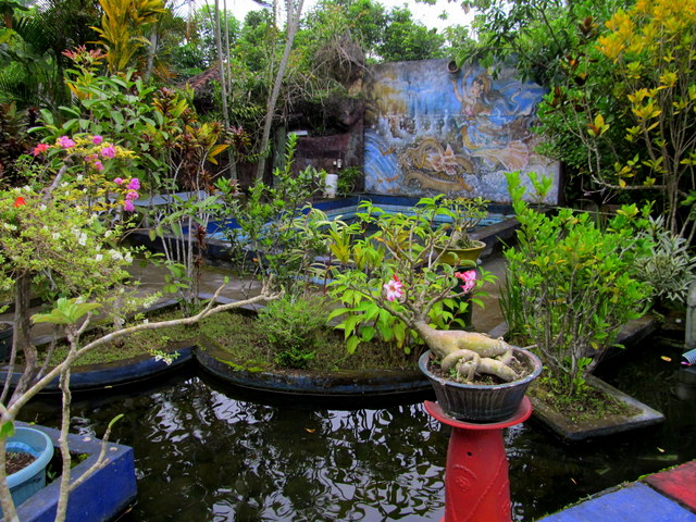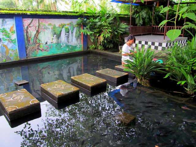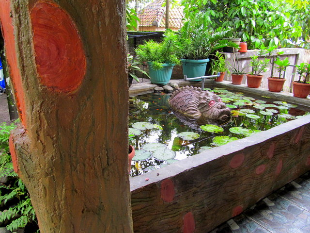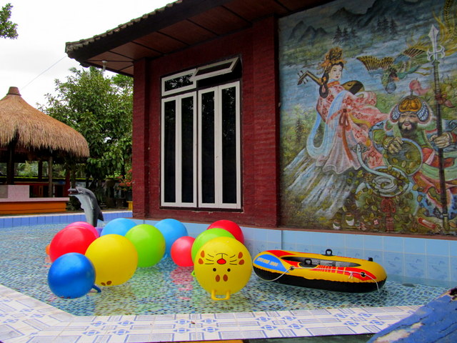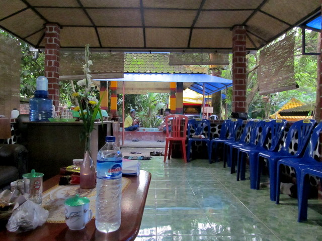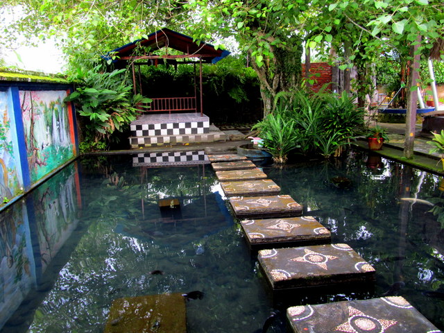 reached through a gate at the far corner of the estate, behind the wall of a plunge pool (currently under construction) to be used for ritual cleansing. Chickens and dogs roam the grounds freely, and children loll around searching for the fish, turtles and fish. A couple of rusty kiddy rides stand untouched, unused for many years. Bleating goats and crowing roosters compete for airtime with an imam calling faithful to prayer from somewhere over the rice fields nearby; a constant reminder that this is, still and after all, Muslim territory.