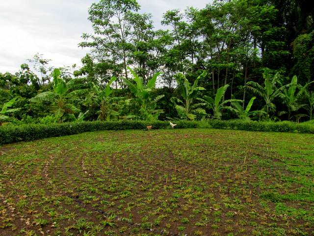 IMG_0196For a long time, I’ve had regular company at the labyrinth. So too have the organic and medicinal gardens: among the patches of leafy lettuce, kale, broccoli, cassava, basil and long beans, a couple of ayam kampung (free-range chickens) have been roaming and exploring, picking and plucking, nipping at insects, having a grand ol’ time. A brown chicken (ayam coklat) and a white one too (ayam putih), they’ve been a regular topic of conversation between the gaIMG_0195rdeners and myself.