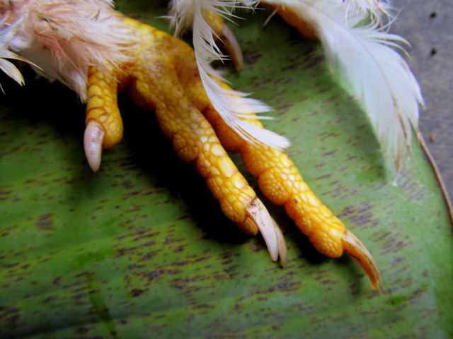 I grabbed my camera and followed him down to the staff workroom. Dino had already set out a massive banana leaf as his cutting board and quickly went to work, pulling off feathers, cracking bones, tearing skin off meat. SlicingIMG_0355 the bird right down the middle, innards came out next; heart, intestines, you name it – even a few little blood-covered eggs that hadn’t yet matured.