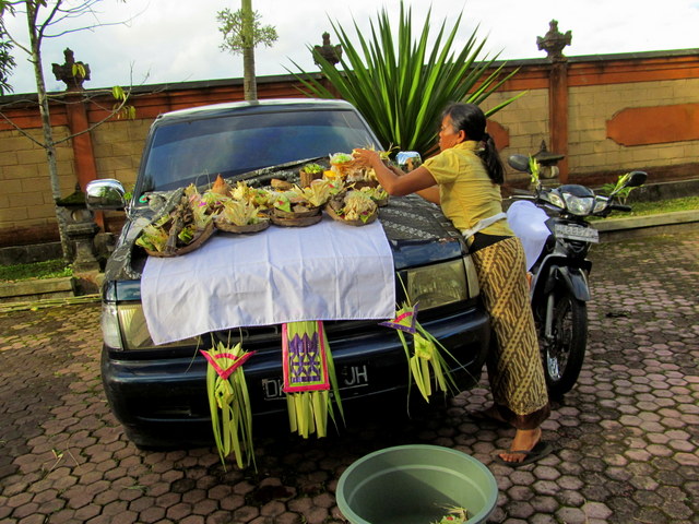 Closer to home, I looked on as Ibu Renate arranged offerings all over Mita’s car and Bill’s bike. It was Tumpek Landep, after all, the festival when we