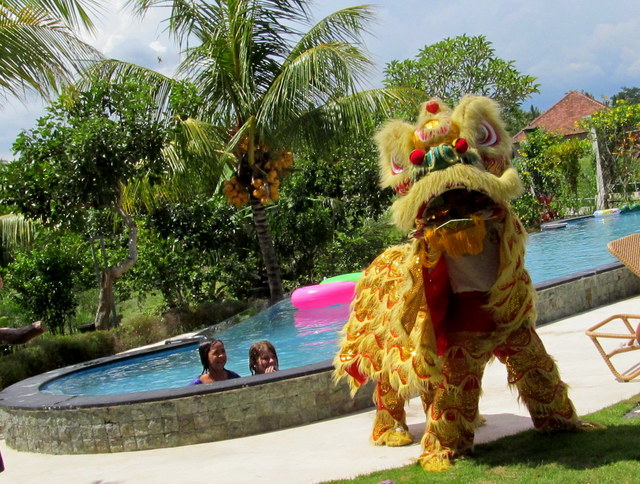 Universal aspirations aside, CC pulled out all the stops: Red-colored decorations around the compound; umbrellas, lanterns, dragon statues, flags, flowers and treats. Even her dress was red satin inlaid with golden threads. Food and dessert overflowed, plenty for a sizable army. Drumming accompanied a 2-man lion dance. A 6-man musical group serenaded th