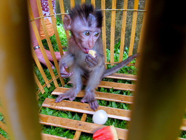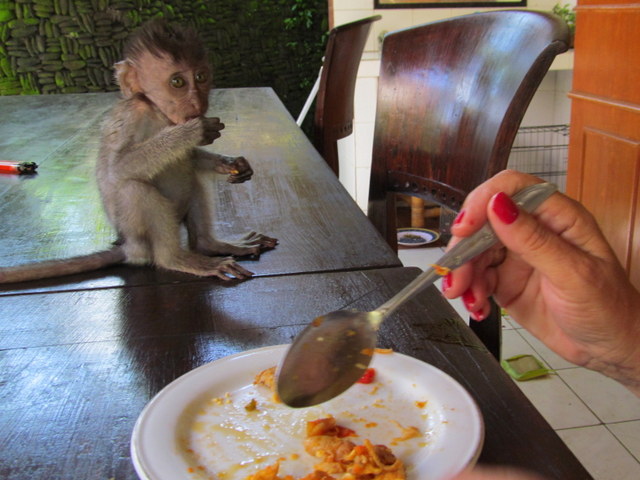 And so we now have in our midst a Darling monkey that has endeared herself to (some of) the guests and staff; that squeaks like a plastic toy squeezed too tight; that shrieks when S leaves her caged; that feeds on whatever the human species congregating around the table eats and leaves behind; that pounces uninvited onto the backs and shoulders of unsuspecting dawdlers; that stares right into your eyes as if to ask: when are you going to feed me some of that delicious fruit you’re eating?IMG_0633