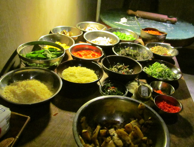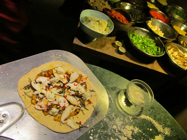 An array of visually dazzling goodies: grilled pumpkin & eggplant, fresh basil, pesto, peppers, sambal mata, button mushrooms, shiitake, salmon, tuna, oregano, coriander, rosemary, tomato sauce (tomatoes freshly picked from the organic garden), mozzarella and the sheer delight of home-made chevre (goats idling elsewhere)…