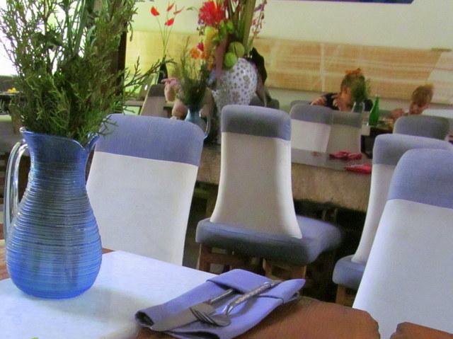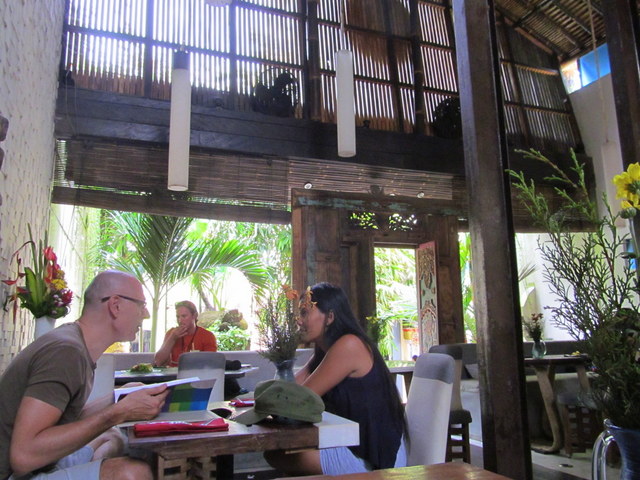 When we turned the corner and spotted the sign, the driver hauled my bag out of the trunk and up the stairs. I found T and her friend sitting at a table by the front windows, and I joined them there, squatting on the cushioned banquette. I looked around, got my first taste – and sights – of Ubud.
