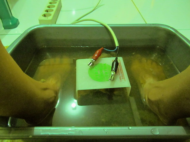But then with one glance at J and quick scan of her body, Made brought his hands to his neck and precisely identified the health issues that had compelled J to seek out this therapy. J sat down on a plastic chair near Made and placed her bare feet into the tub ‘o warm water – to which was attached two cables with battery-like chargers. I immediately expected to see her jolt in her seat. Nada. She just soaked.