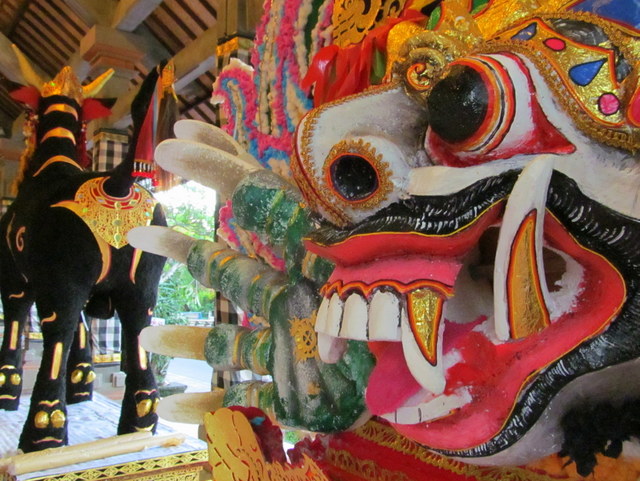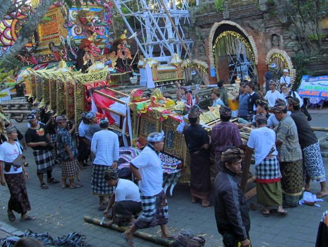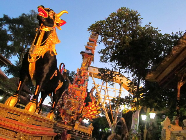 The site in front of Puri Ubud was, as it had been two years ago, a place humming and strumming with activity. Bamboo poles being tied together to construct platforms, sarcophagi and towers, sponsored Styrofoam banners proclaiming the death, massive and ornately detailed decorations, masks, and hundreds of villagers and tourists.