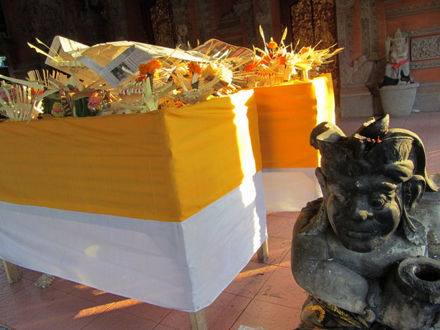 What to do with a dead body that cannot be cremated in a timely manner? If you’re a member of the Puri Agung Ubud family, tradition dictates that you lay the body (once doused in formaldehyde) in state, inside the family compound, on a bale (pavilion). Then, you proceed to present daily offerings, lead prayers, and – yes, ’tis true – you feed the man. This I learned from none other than Tjok Sukawati’s son Raka, whom I first met at the 2011 royal cremation and saw again yesterday.