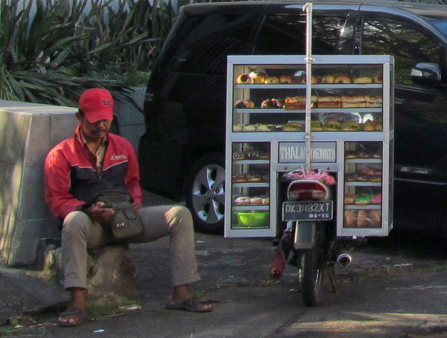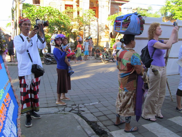 At dawn and dusk in particular, there was an unmistakably amusement park or county-fair like feel to the intersection; food carts, balloons and other kids’ games for sale, women hawking sarongs or krises (ceremonial knives), vendors selling newspapers, coconuts, babi guling (suckling pig), trucks hauling and dumping materials, men smoking and joking, mothers bearing infants on motorbikes, fathers carrying infants around the platforms. Eventually, I even spotted a thin man selling plastic bags full of cotton candy. I’m sure some wondered: is this a cremation.. or a carnival?