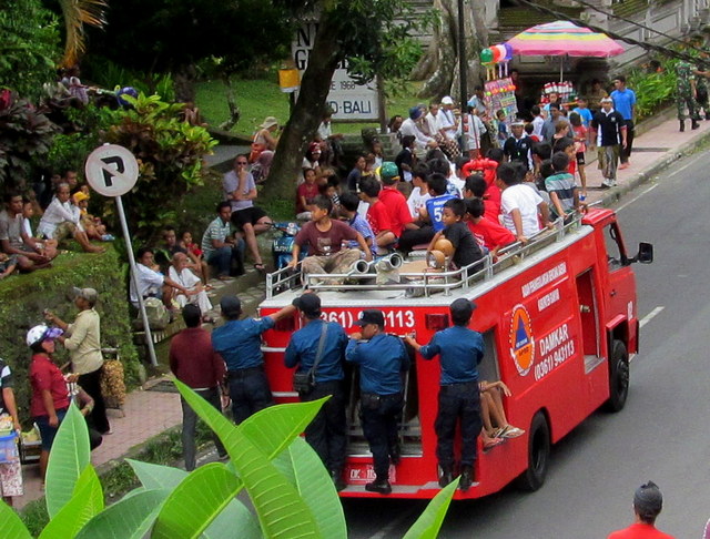 Male villagers, dozens at a time, hoisted and carried the multi-ton 22-meter tall bade (cremation tower) and five-meter tall lembu selem (bull sarcophagus). Villager women and female members of the royal family tip toed cautiously in their high heels while children pranced in puddles. Priests and family members sat atop the platforms as well, including a handful that stood leaning out and swaying – a frightful sight – near the top of the highest tower. There was also a five-meter long naga banda (dragon) mounted on yet another platform that was carried along the route.