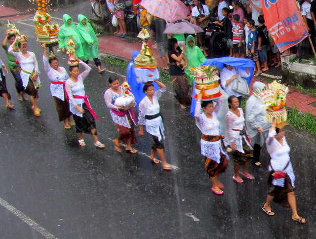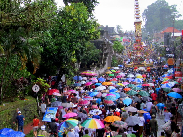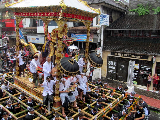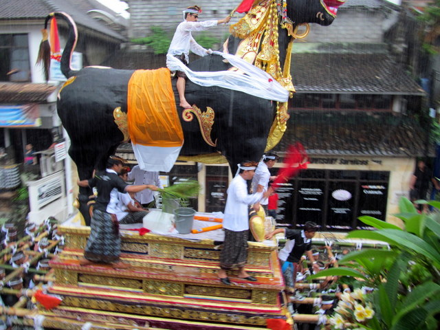 For the proceedings themselves – the long procession down Jalan Raya until the cremation grounds – my friend and I claimed excellent viewing spots, alongside many other spectators, from the top balcony of café Kue. We were lucky indeed. Just after noon, when the procession was meant to begin (and begin it did!), the heavens opened and the rains came down. Not just a simple rainfall; this was a downright torrential downpour. The kind you expect to only see in the middle of rainy season. We watched as the revelers (really, that’s what the Balinese do at cremations, they revel!) got soaked through, yet the procession never came to a halt.