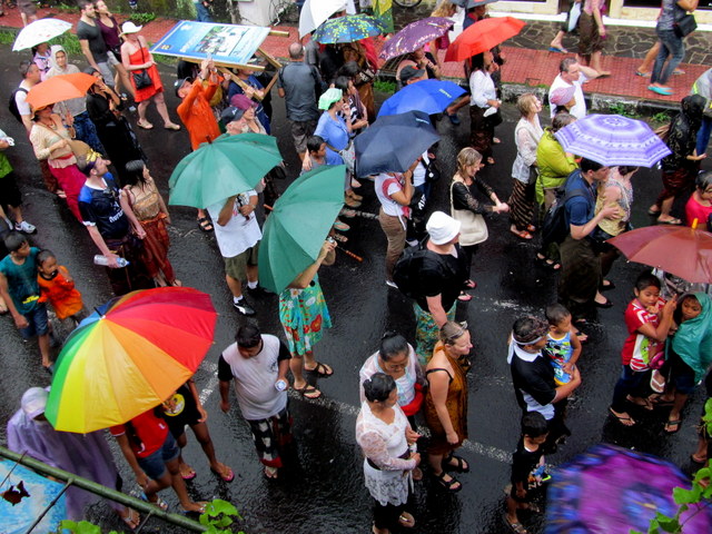 And then, the crowds passed, drenched but with colorful umbrellas in hand, as they made their way to the Setra Dalem Puri cemetery, abutting the Pura Dalem Puri temple and Peliatan village pavilion (watilan) – right at the top end of my street. They were going to witness the burning (of the) man and blazing of the bull. And all the rest of the paraphernalia.