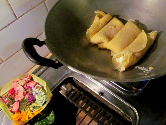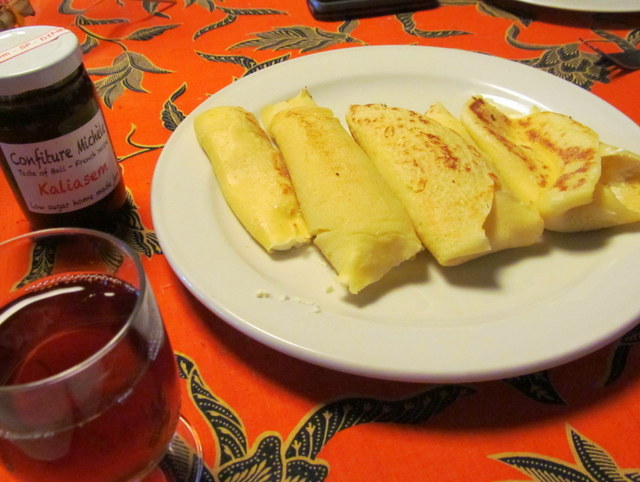 I turned down Monkey Forest Road, which had all but emptied out of tourists and vehicles, then walked down a path to Sherry’s house. Once we got past the chit-chat and my much-needed rest, we headed to the kitchen, where we whipped up a bunch of ingredients that we’d patched together, then lightly fried them in a wok, spooned on a bit of homemade tropical kaliasem jam, guzzled a bit of brem wine and dug into a batch of what I believe must have been the tastiest and creamiest (and just possibly the first) Balinese Cheese Blintzes this side of the Dead Sea.