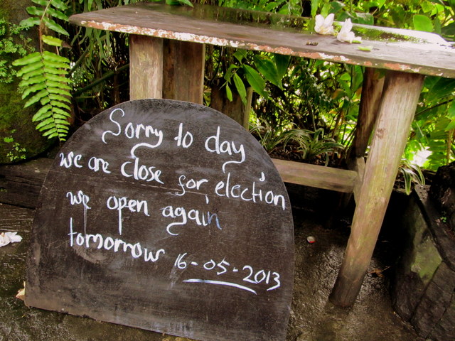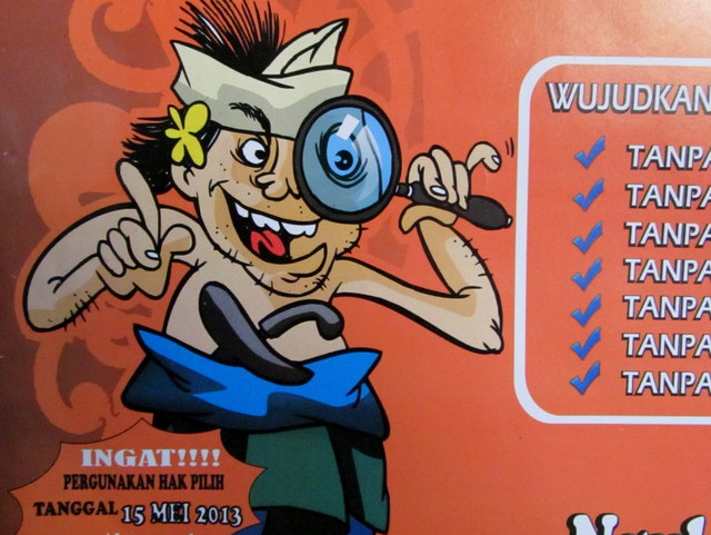 I noticed (because it’s hard to miss) that the watilan (covered gathering pavilion for meetings, musicians and tourist bus drivers who need a rest) was all abuzz. Posters, plastic chairs, tables, offerings, signs and more signs. Some particularly humorous ones, Balinese caricatures drawn to explain the process. It was, after all, Election Day across Bali! Offices were closed (as were some restaurants and shops) while people headed to the polls to elect a new Governor.