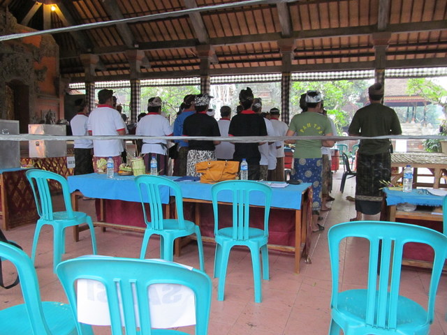 The rest of Ubud showed signs of election day as well; though for the run-of-the-mill tourist these signs would have largely passed unnoticed; a mere flint to the fireworks of the day before. But I noticed those signs too; in the pavilion across the palace the polling clerks were dressed in traditional garb, lined up, each holding lit incense sticks, gathered in prayer before taking up their official duties. Offerings sat alongside ballot boxes. All signs of the cremation had disappeared from sight.
