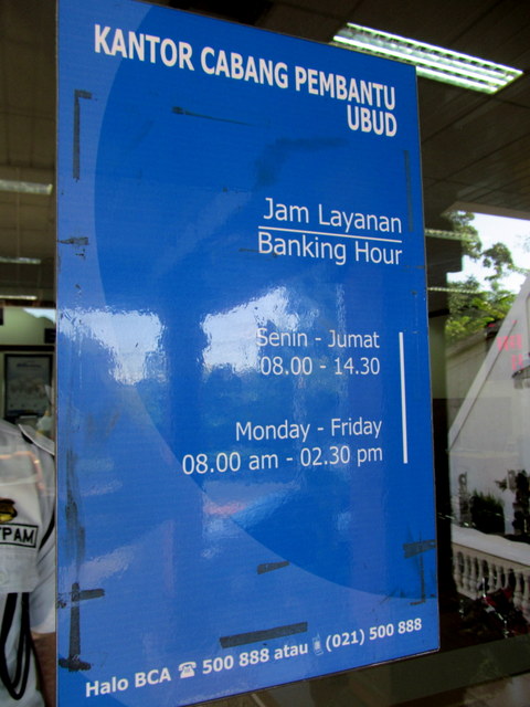 Surprised by the guard’s response? Don’t be. In Bali, this is a perfectly clear, reasonable, logical excuse for tardiness. There are many others. It matters not one bit that the bank might open an hour or two later, nor does it boggle the mind of any Balinese person that not a single employee of that bank lives in Ubud.