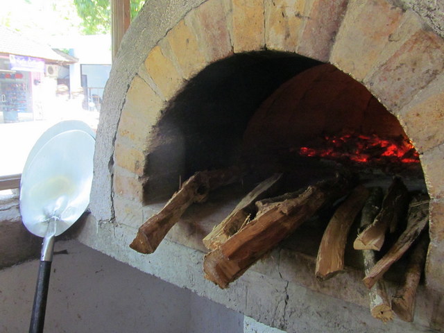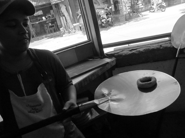 Which is why it made perfect sense to me to ask Toni if I could try out my experiment in bagel-making at his…ummmm… pizzeria. Really, why not? Well, it turns out (duh) that pizza dough is not quite the best substitute for bread dough. In other words, you might want to stick to pizza dough for making pizzas and.. well, you get the point. But I wasn’t going to be put off by such banalities. IMG_9751So when I arrived at the pizzeria this morning with a small packet of my dried ‘secret ingredient,’ Toni kicked his staff into high gear. Putu, who was folding napkins, was delegated with the task of providing us with nourishment: a late-brunch of pasta and sorbet; while Sony was sent out to start up the pizza oven (a little earlier than usual), then to help me prepare the dough, roll and shape the bagels, and then slide them into the oven.