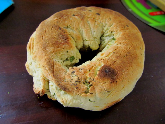 IMG_9758Toni and I dug into our respective pasta dishes with gusto, while intermittently glancing over at the oven. It was clear that Sony was out of his element; an Indonesian trained to cook Italian food was now being thrown into the deep end – asked (with no prior experience of bread-making) to whip up a batch of strange-looking bagels. What we (tamu) won’t throw at them.. and how they will (usually, gladly) acquiesce…IMG_9760There was much to- and fro-ing: A befuddled Sony tentatively withdrew the only-slightly hardened but still-doughy rounds out of the fire, walked over to us, displaying the strange-looking nuggets to us with a face that belied his puzzlement. Toni cut one of the bagels in half, then sent Sony back to the oven, with instructions in Indonesian that I barely understood.