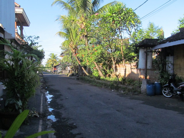 IMG_9945In the early morning, I quietly saunter out to where the path meets the road, but mindful not to step onto the road. The bamboo curtains of the warung across the road are tied up. A dog sleeping on the road looks up at me momentarily, as if to challenge my presence in taboo territory (dogs, apparently, are exempt).