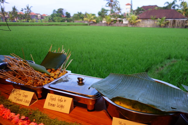 Where else will you see serving plates piled high with towering cones of brown rice, surrounded with various cooked vegetables, tempe and peanuts known as nasi tumpeng? Or, throughout the days, a colorful blend of healthy food; satay sticks, fresh papaya and watermelon, raw chocolate